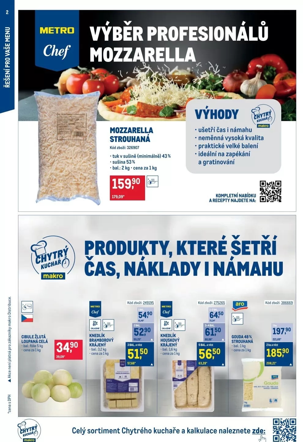 V letáku obchodu Makro najdete široký výběr produktů, které šetří čas a námahu v kuchyni. Mezi nimi je strouhaná mozzarella s minimálním obsahem tuku 43% a sušinou 53%, balená po 2 kg za cenu 179,09 Kč za 1 kg. Ideální na zapékání a gratinování.