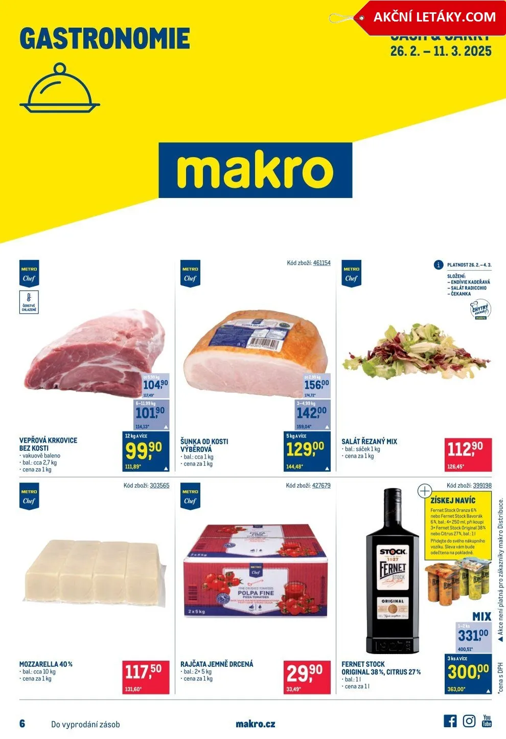 V letáku najdete také salát řezaný mix v sáčku o hmotnosti 1 kg a fernet Stock Original 38 % s citrusy. Akce platí od 26. února do 11. března 2025, do vyprodání zásob. Navíc můžete získat slevu na vybrané produkty. Navštivte nás na makro.cz pro více informací!