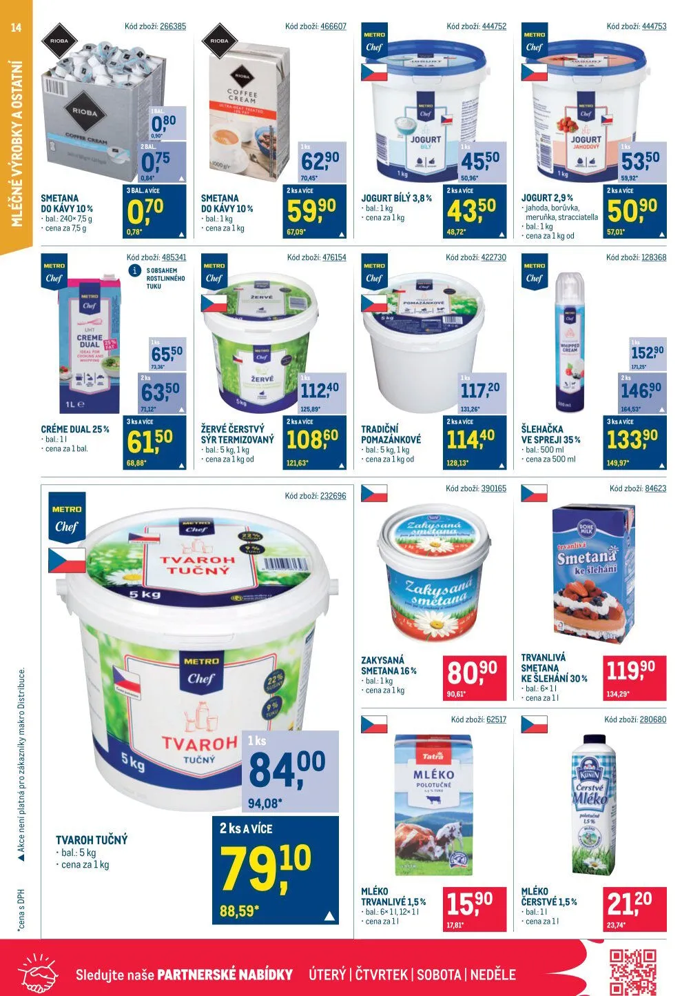 V letáku obchodu Makro najdete širokou nabídku kvalitních mléčných produktů. Nabízíme jogurty s různými příchutěmi, jako jsou jahoda, borůvka, meruňka a stracciatella, v balení po 1 kg. Dále máme smetanu do kávy a zakysanou smetanu, obě v balení 1 kg. Pro milovníky tvarohu nabízíme tučný tvaroh v 5 kg balení. Nezapomeňte také na naši šlehačku ve spreji a tradiční pomazánkové máslo. Všechny produkty jsou k dispozici za výhodné ceny. Navštivte nás v úterý, čtvrtek, sobotu a neděli a využijte našich partnerských nabídek!