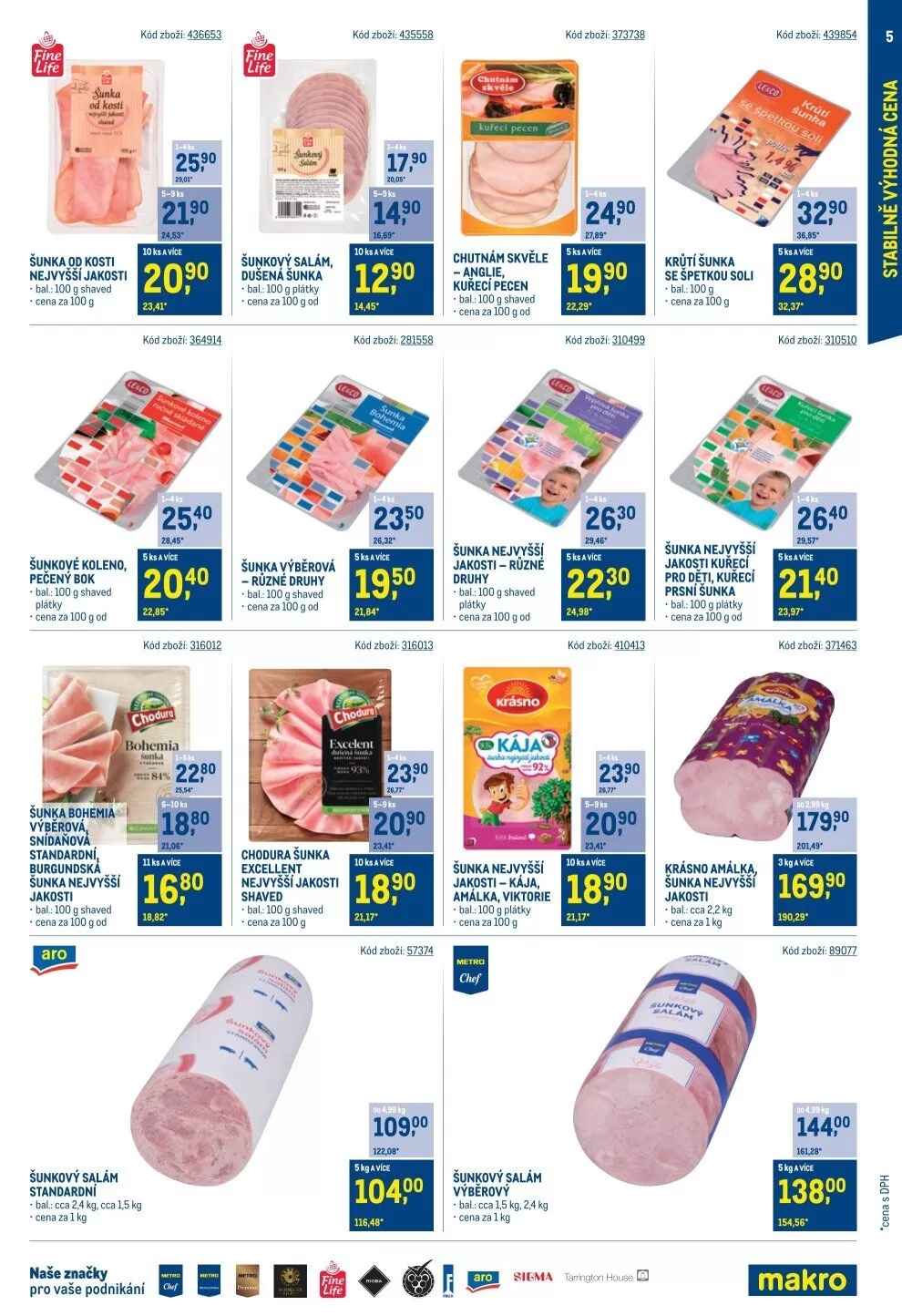 V letáku obchodu Makro najdete širokou nabídku kvalitních šunek a salámů. Nabízíme šunku od kosti nejvyšší jakosti, balenou po 100 g, s cenou od 5,90 Kč za 100 g. Dále máme šunkové koleno a pečený bok, také v plátcích po 100 g.