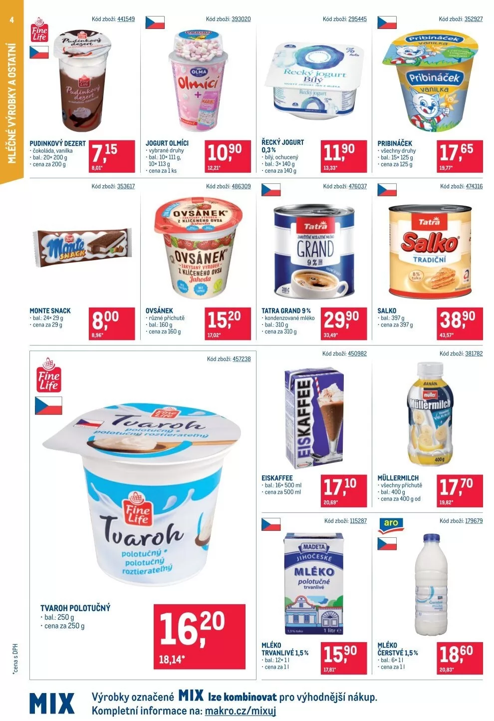 Mezi mléčnými výrobky najdete polotučné mléko, tvaroh a kondenzované mléko Tatra Grand.