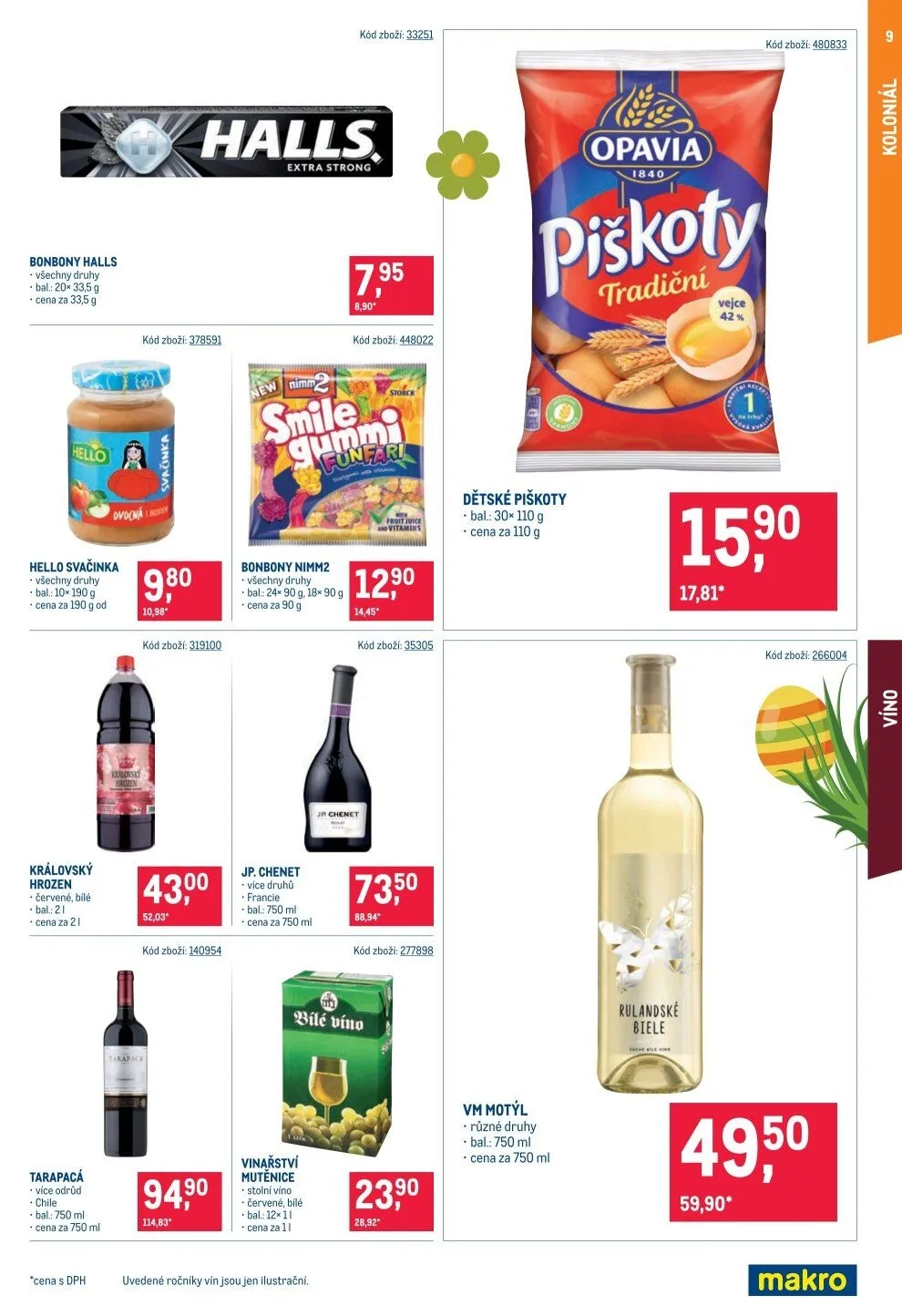 V letáku obchodu Makro najdete širokou nabídku produktů. Mezi nimi jsou bonbony Halls ve všech druzích, balení 33,5 g za cenu 33,5 Kč. Dále si můžete vybrat Hello svačinku, také ve všech druzích, cena za 190 g začíná na 10,98 Kč.