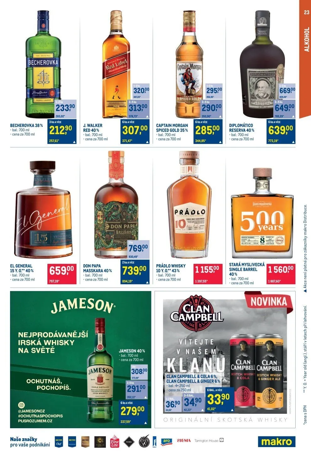 V letáku obchodu Makro najdete širokou nabídku kvalitních alkoholických nápojů. Mezi nimi se nachází Becherovka 38 % v balení 700 ml za cenu 283,02 Kč. Dále nabízíme Johnnie Walker Red Label, Don Papa Masskara a Captain Morgan Spiced Gold, všechny v balení 700 ml.