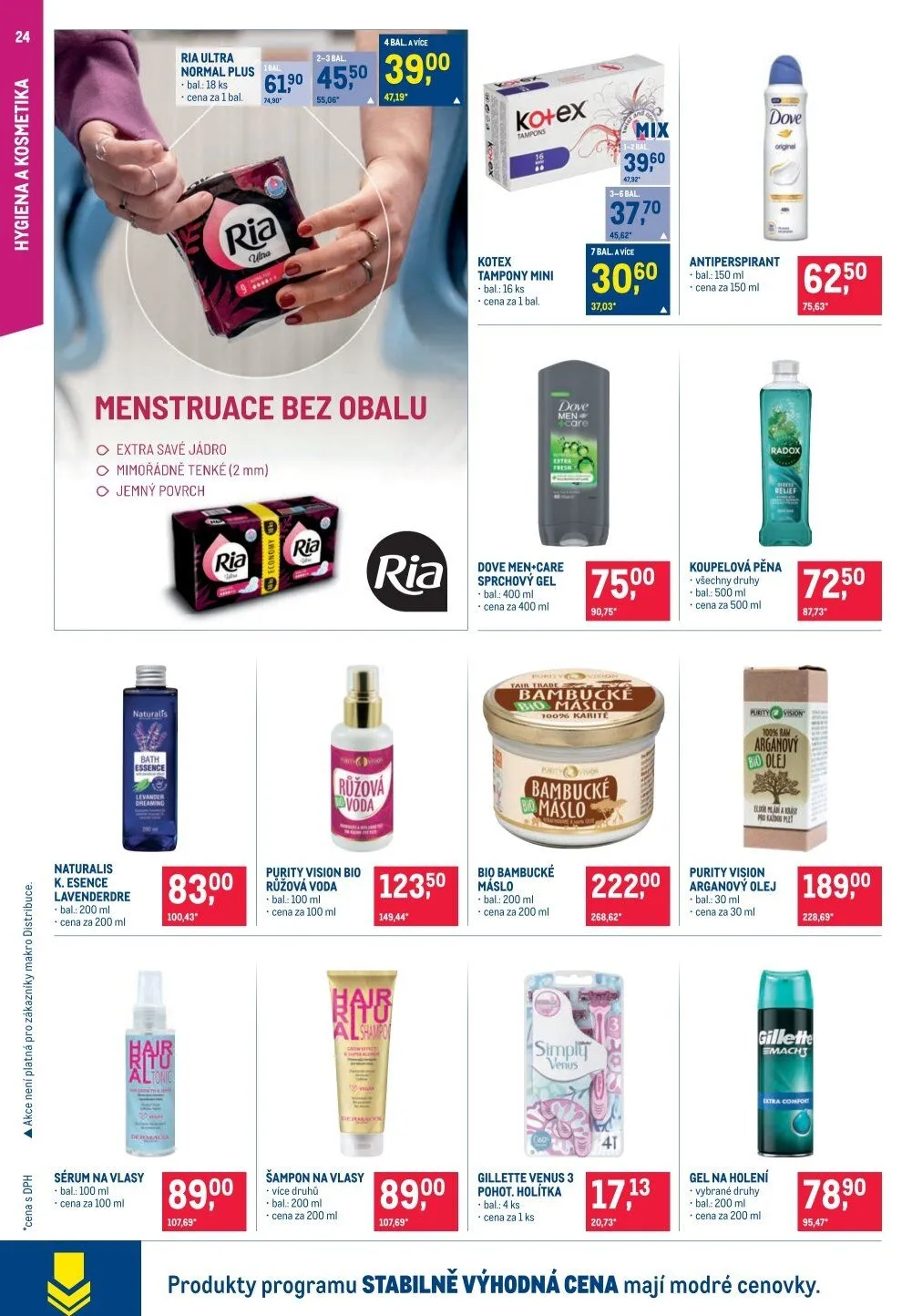 V letáku obchodu Makro najdete širokou nabídku produktů za výhodné ceny. Mezi nimi jsou například tampony Kotex mini v balení po 16 ks za 77 Kč. Pro muže je k dispozici sprchový gel Dove Men Care o objemu 400 ml za 309 Kč.