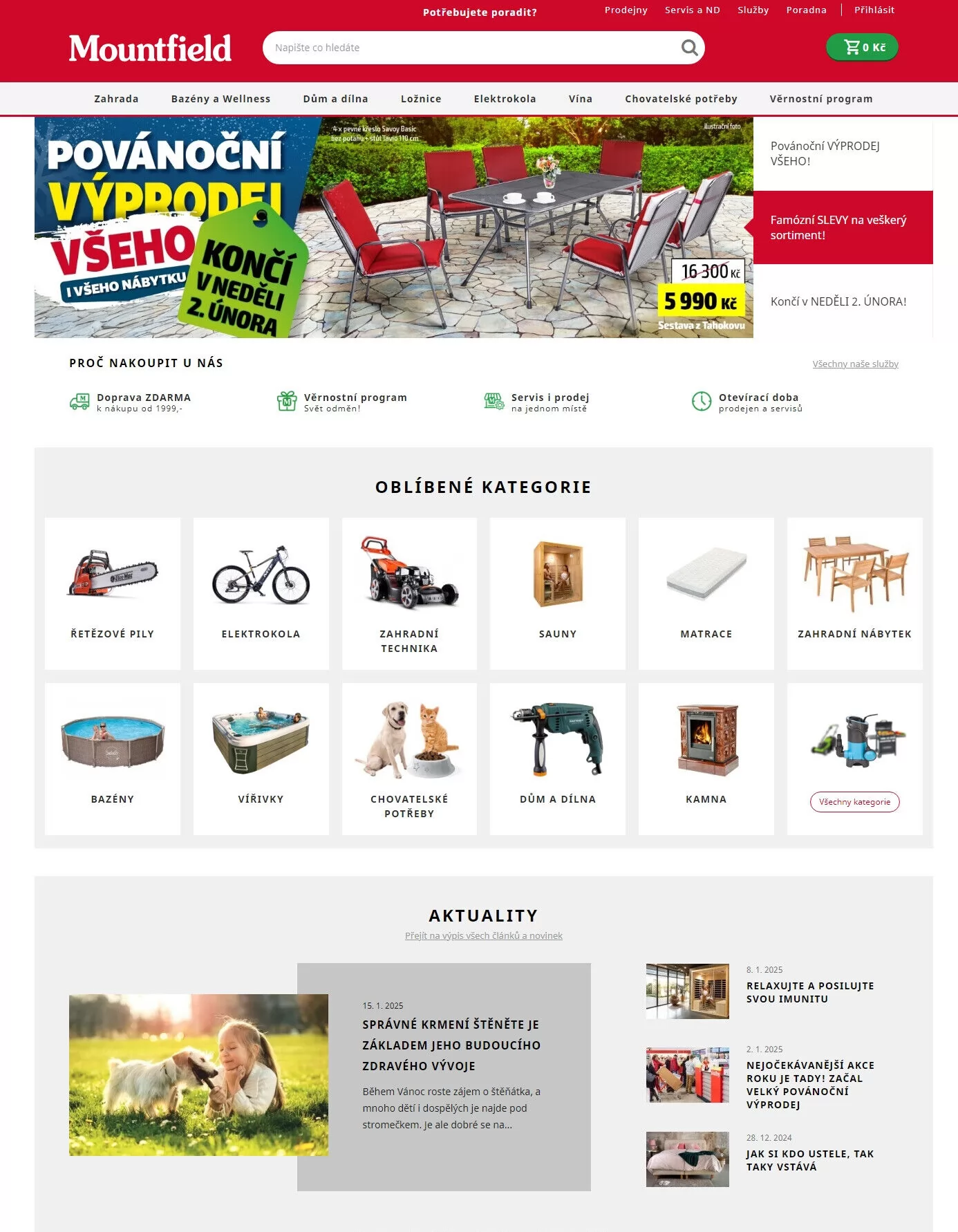 V letáku obchodu Mountfield najdete širokou nabídku produktů pro vaši zahradu, dům a dílnu. Nabízíme bazény a wellness zařízení, zahradní techniku, elektrokola a chovatelské potřeby. Nezapomněli jsme ani na nábytek do ložnice a další vybavení pro váš domov. Využijte famózní slevy na veškerý sortiment a dopravu zdarma při nákupu nad 1999 Kč. Navíc se můžete zapojit do našeho věrnostního programu a získat další výhody. Nepropásněte povánoční výprodej, který končí 2. února!