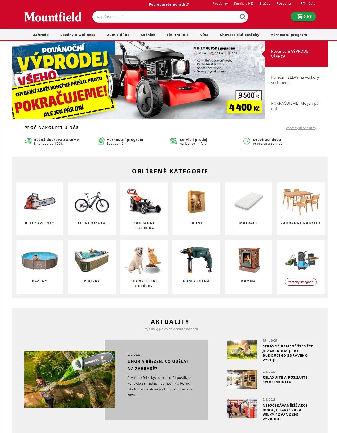 V letáku obchodu Mountfield najdete širokou nabídku produktů pro zahradu, dům a dílnu. Nabízíme kvalitní zahradní techniku, jako jsou motorové pily a sekačky, které usnadní vaši práci na zahradě. Nezapomněli jsme ani na bazény a wellness, kde si můžete užít relaxaci. Pro milovníky přírody máme v nabídce elektrokola a chovatelské potřeby pro vaše domácí mazlíčky.
