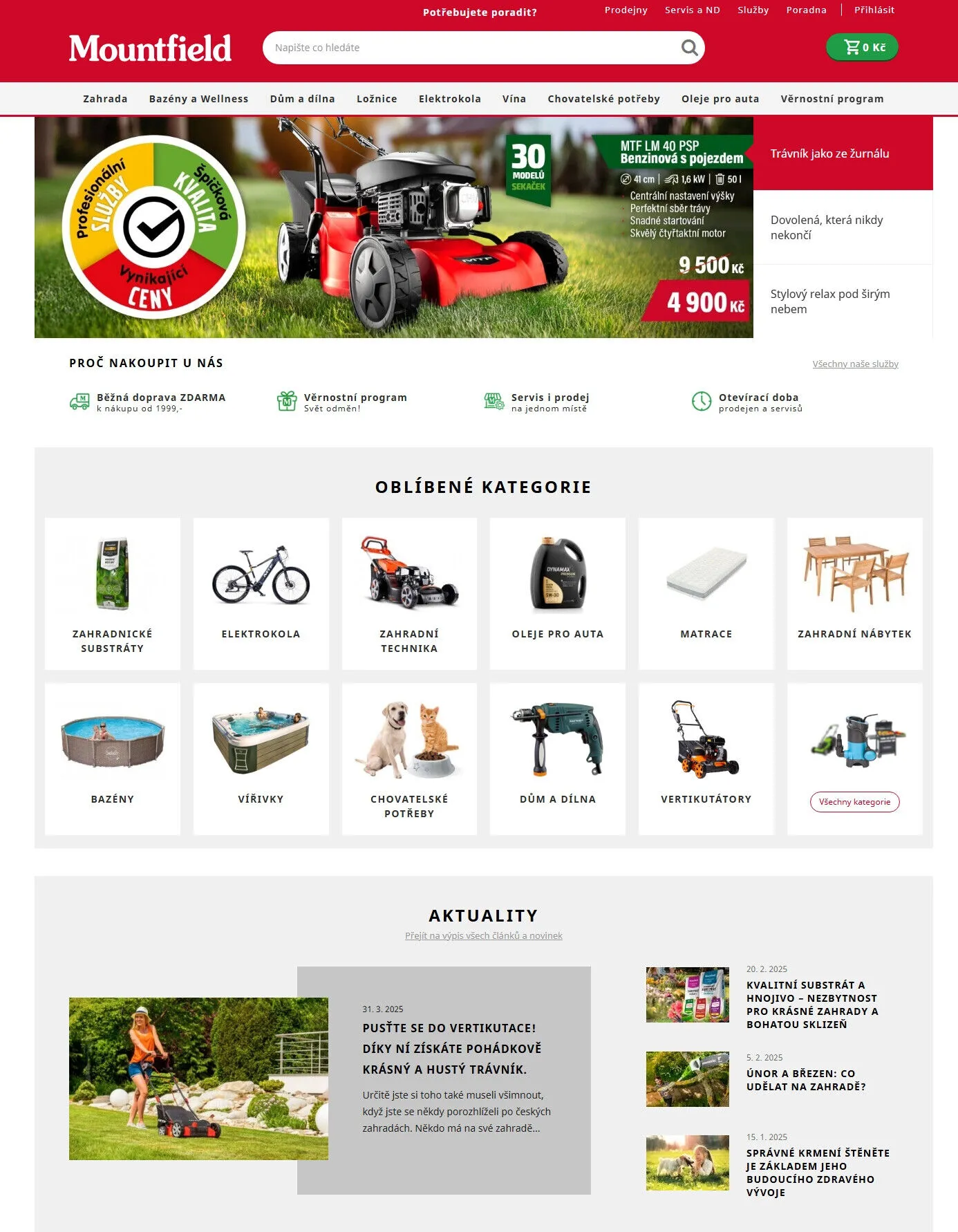V letáku obchodu Mountfield najdete širokou nabídku produktů pro vaši zahradu, dům a volný čas. Nabízíme kvalitní zahradní techniku, jako jsou sekačky s centrálním nastavením výšky a skvělým čtyřtaktním motorem, které zajistí perfektní sběr trávy. Pro milovníky vody máme v nabídce bazény a wellness produkty, které přinesou stylový relax pod širým nebem.