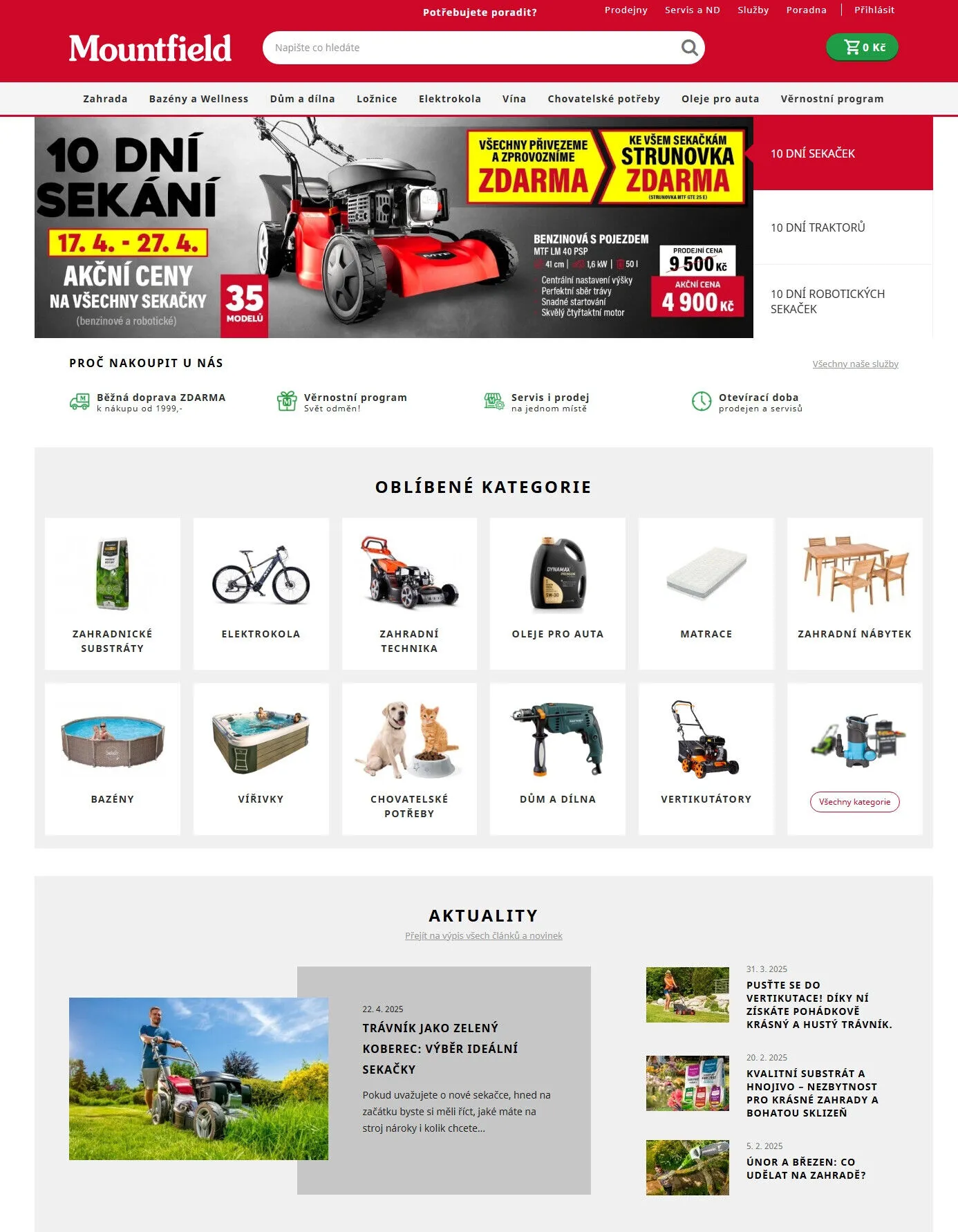 V letáku obchodu Mountfield najdete širokou nabídku produktů pro vaši zahradu, dům a dílnu. Nabízíme akční ceny na všechny sekačky, včetně benzínových a robotických modelů. V období od 17. 4. do 27. 4. můžete využít speciální akci, kdy k nákupu sekaček získáte strunovku zdarma.