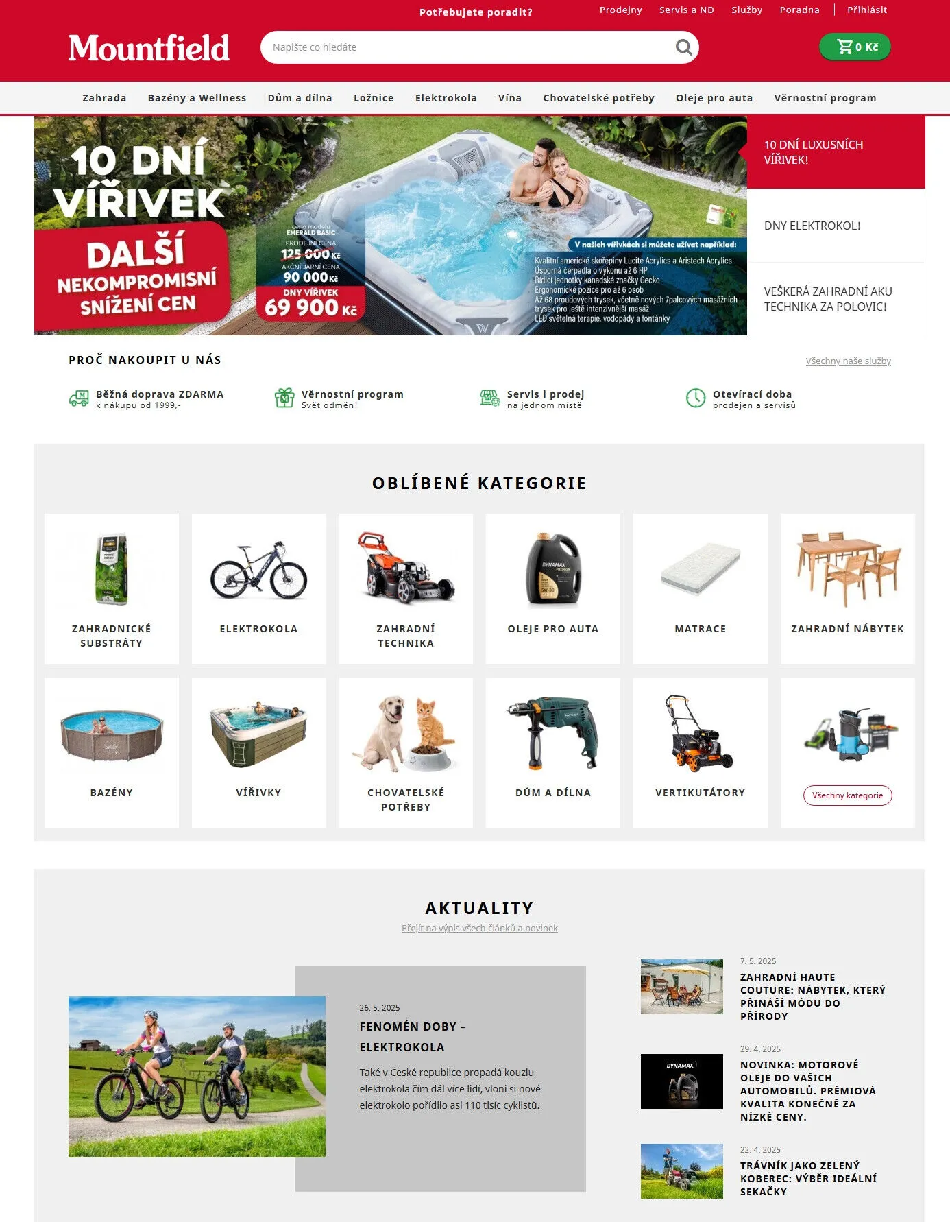 V letáku obchodu Mountfield najdete širokou nabídku produktů pro vaši zahradu, dům a dílnu. Nabízíme kvalitní bazény a wellness zařízení, včetně vířivek s ergonomickými pozicemi a intenzivními masážními tryskami. Nezapomněli jsme ani na elektrokola, která se stávají stále populárnějšími.