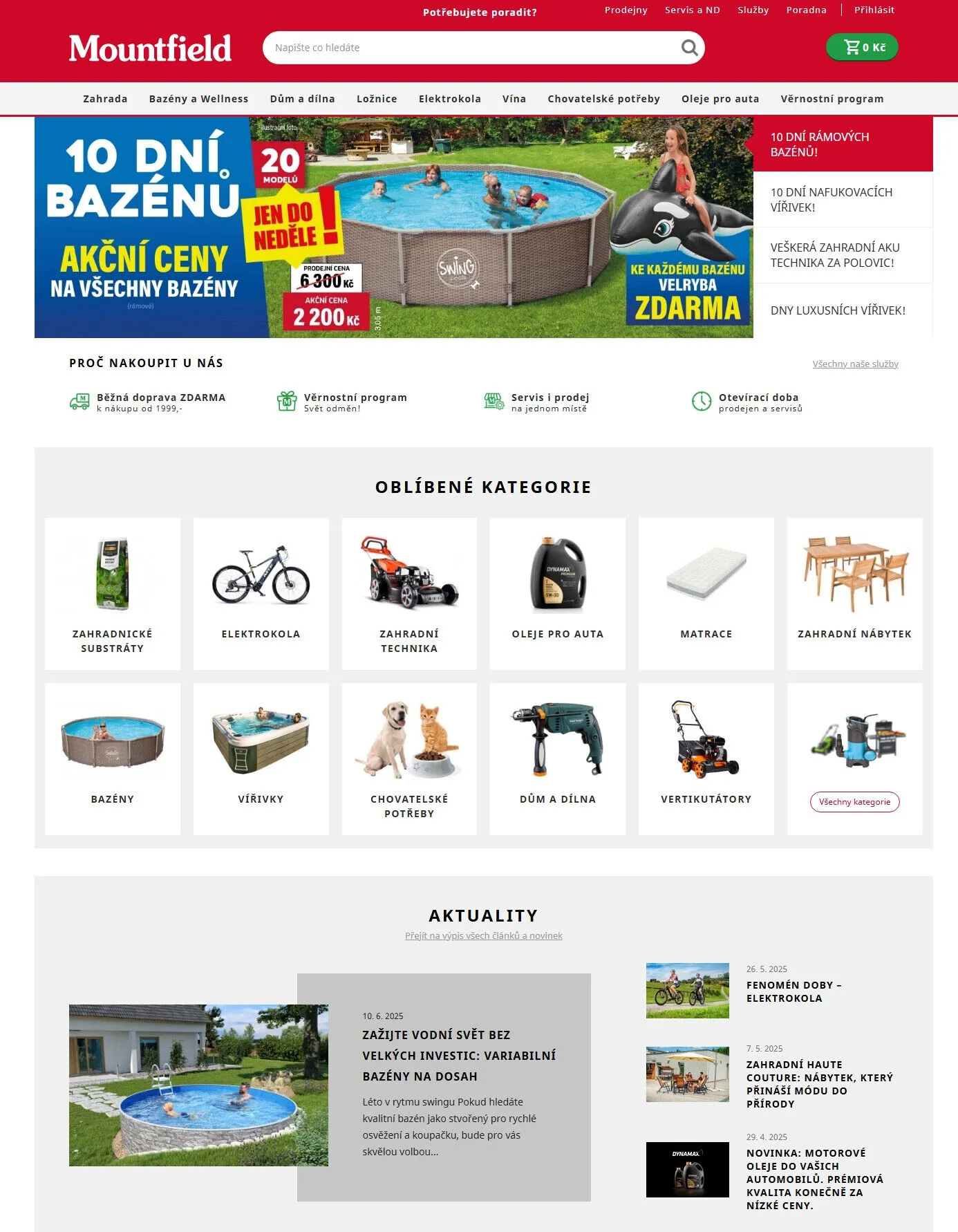 V letáku obchodu Mountfield najdete širokou nabídku produktů pro vaši zahradu, dům a volný čas. Nabízíme akční ceny na všechny bazény, včetně rámových a nafukovacích variant. Nezapomeňte využít naši nabídku na vířivky a zahradní techniku, která je nyní za polovic!