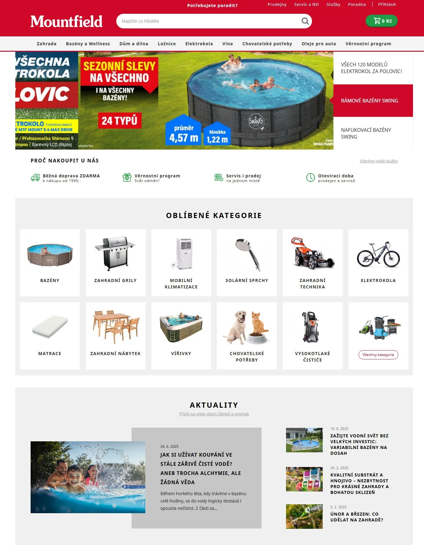 V letáku obchodu Mountfield najdete širokou nabídku produktů pro vaši zahradu, dům a volný čas. Nabízíme elektrokola, bazény a wellness vybavení, zahradní grily a nábytek. Všechny naše služby zahrnují prodej i servis na jednom místě. Využijte sezonní slevy na bazény a další produkty, které jsou nyní za polovic! Nezapomeňte se přihlásit do našeho věrnostního programu a využít dopravu zdarma při nákupu nad 1999 Kč. Prozkoumejte také chovatelské potřeby a zahradní techniku. S námi si užijete léto plné zábavy a relaxace!