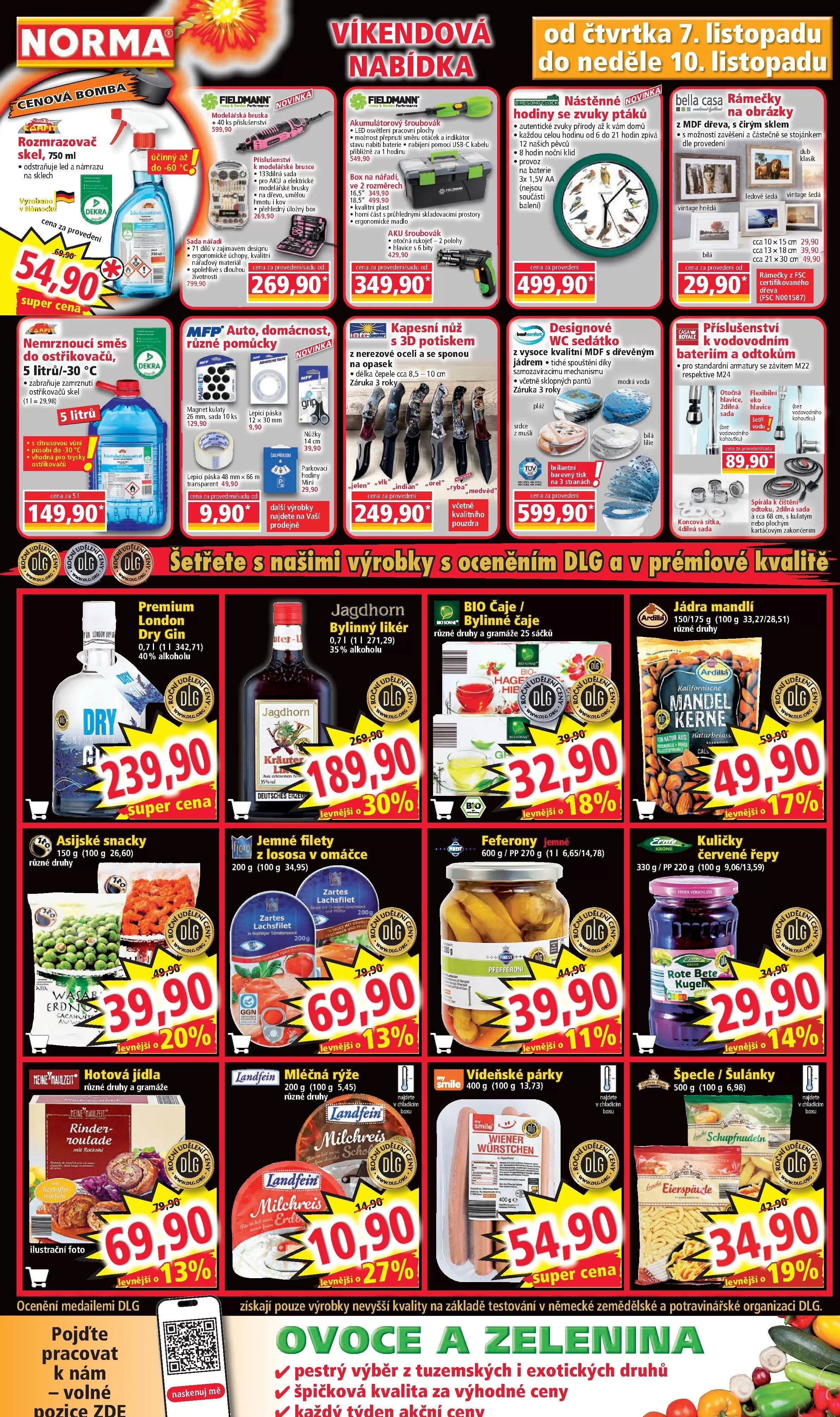 V letáku obchodu Norma najdete širokou nabídku produktů za super ceny. Mezi nimi je rozmrazovač skel a nemrznoucí směs do ostřikovačů za 149 Kč za litr. Dále nabízíme jemné filety za 269 Kč a kapesní nůž s 3D potiskem za 249 Kč. Pro milovníky designu máme nástěnné hodiny se zvuky ptáků za 499,90 Kč a designové WC sedátko za 99,90 Kč.