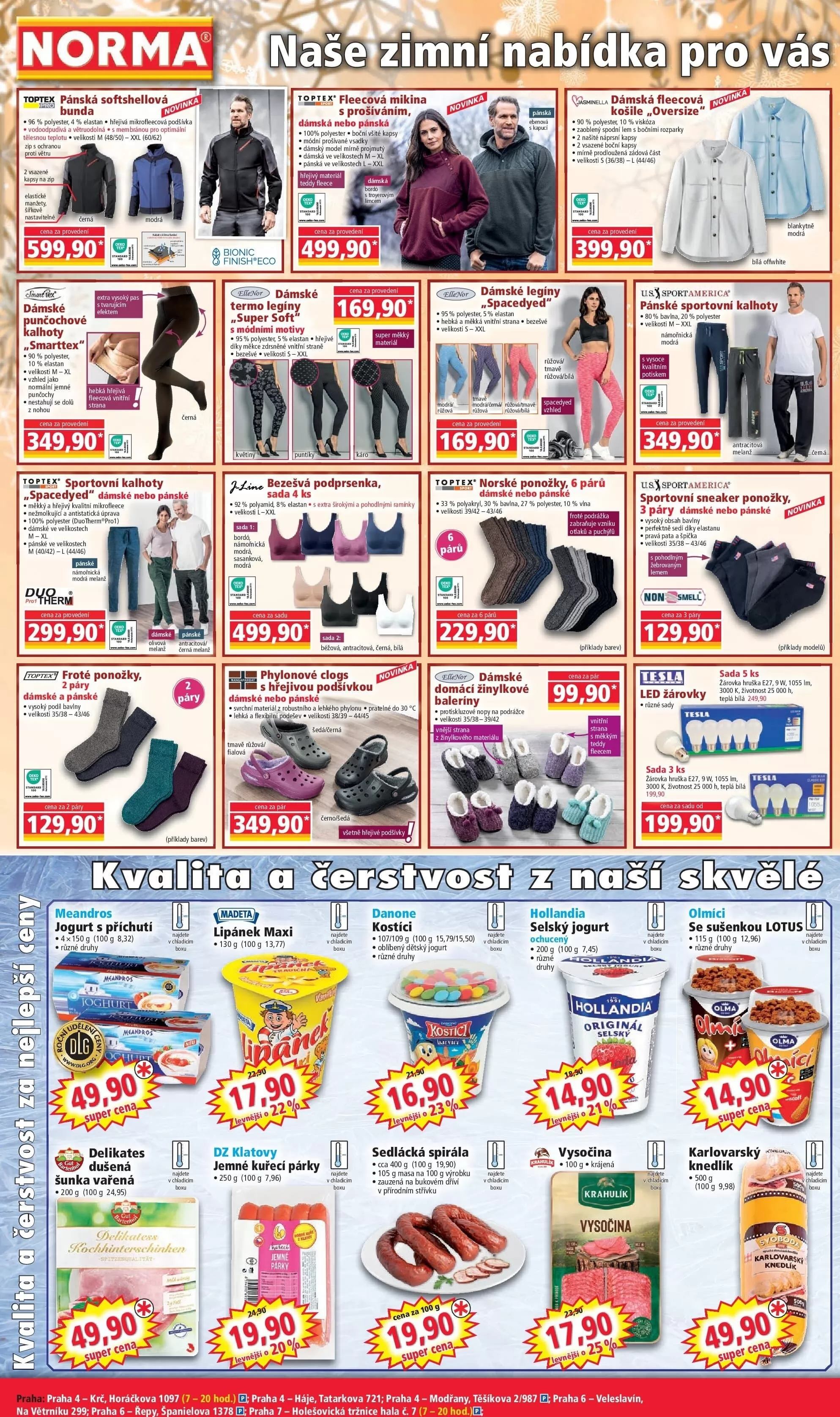V letáku obchodu Norma najdete širokou nabídku produktů pro každého. Mezi pánskými a dámskými oděvy se objevují pánské softshellové mikiny za 99,90 Kč a dámské fleecové bundy za 599,90 Kč. Nechybí ani sportovní kalhoty za 349,90 Kč a dámské legíny „spacedyed“ za 169,90 Kč.
