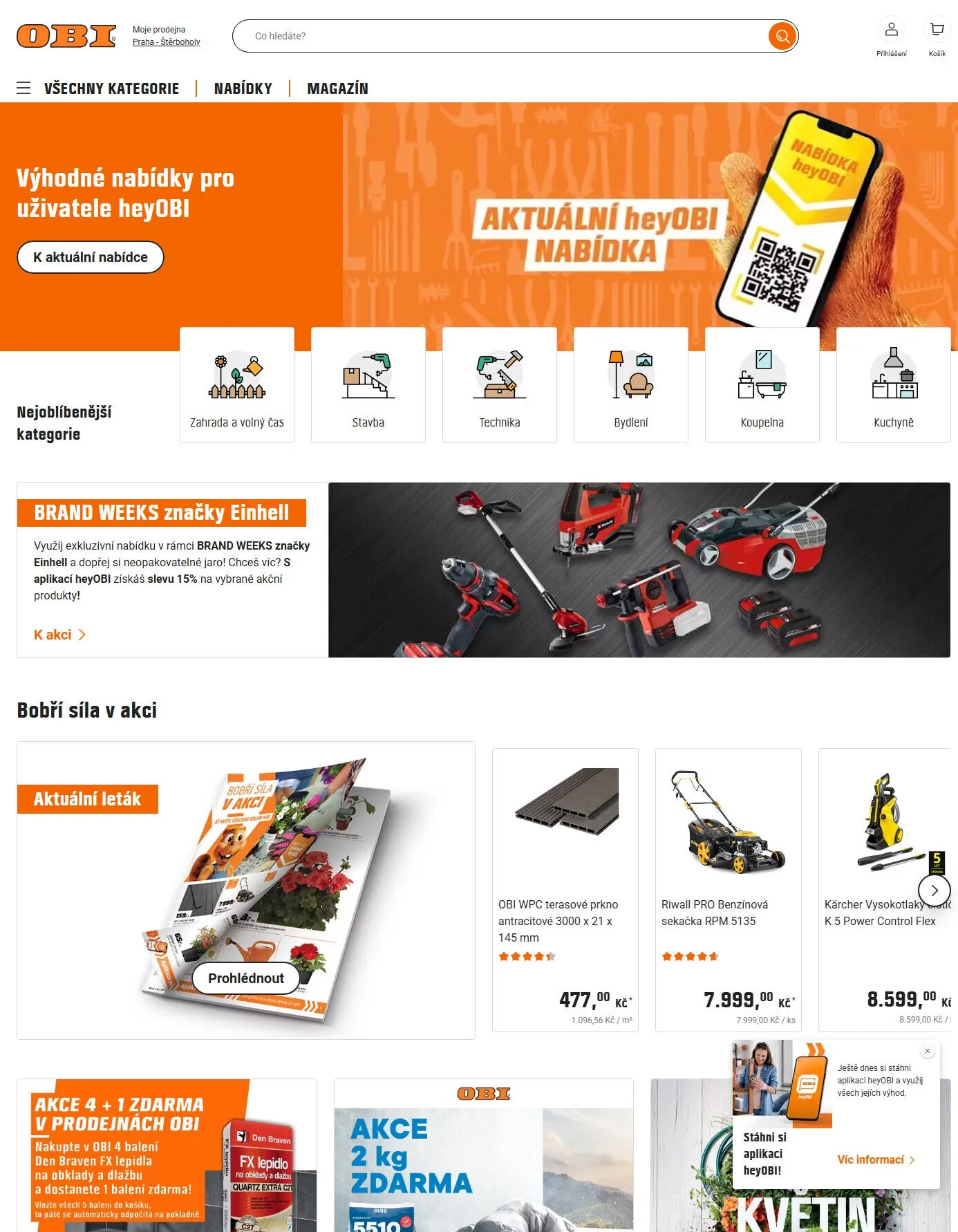 V prodejně OBI v Praze - Stěrboholy najdete širokou nabídku produktů pro zahradu, bydlení a techniku. V rámci aktuální akce "Brand Weeks" značky Einhell můžete využít exkluzivní slevu 15% na vybrané akční produkty s aplikací heyobi.