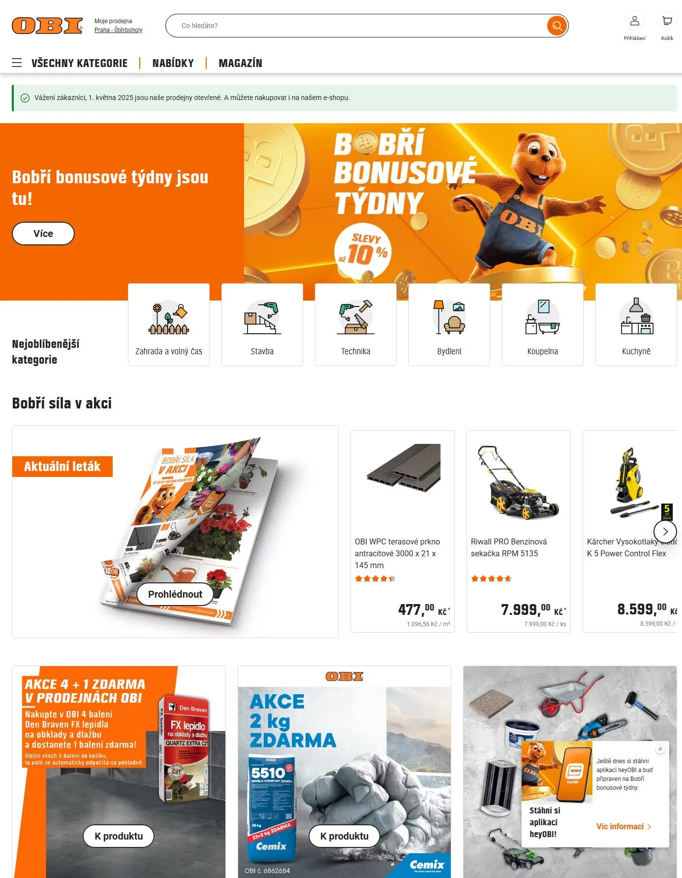 Vážení zákazníci, srdečně vás zveme do našich prodejen OBI, které jsou otevřené i 1. května 2025. V aktuálním letáku najdete skvělé nabídky a slevy na široký sortiment produktů.