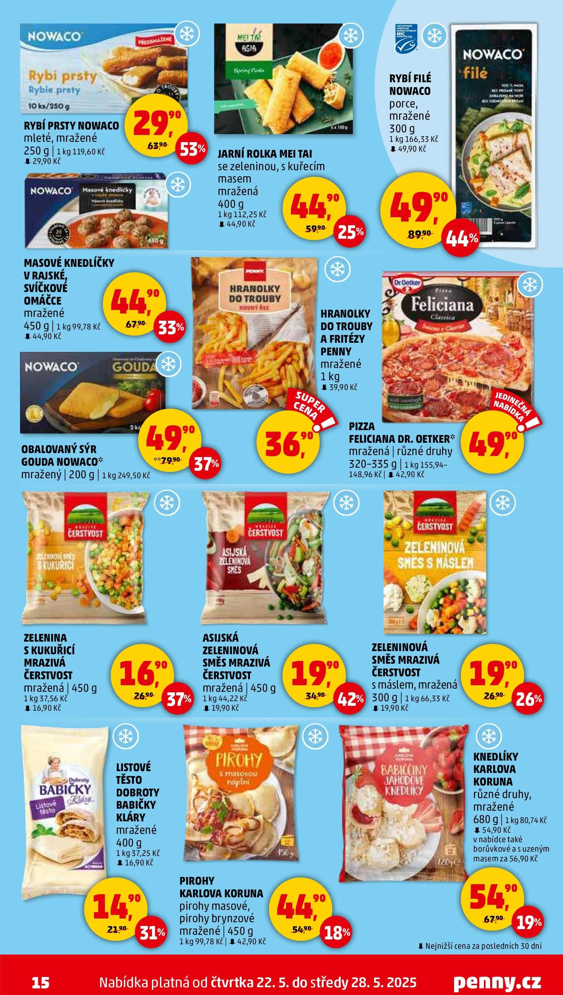 V letáku obchodu Penny Market najdete širokou nabídku mražených produktů. Mezi nimi jsou rybí prsty Nowaco za 29,90 Kč (250 g) a masové knedlíčky v rajské nebo svíčkové omáčce za 44,90 Kč (450 g). Dále si můžete vybrat jarní rolky Mei Tai se zeleninou nebo kuřecím masem za 44,90 Kč (400 g) a mražené hranolky do trouby a fritézy za 39,90 Kč (1 kg).