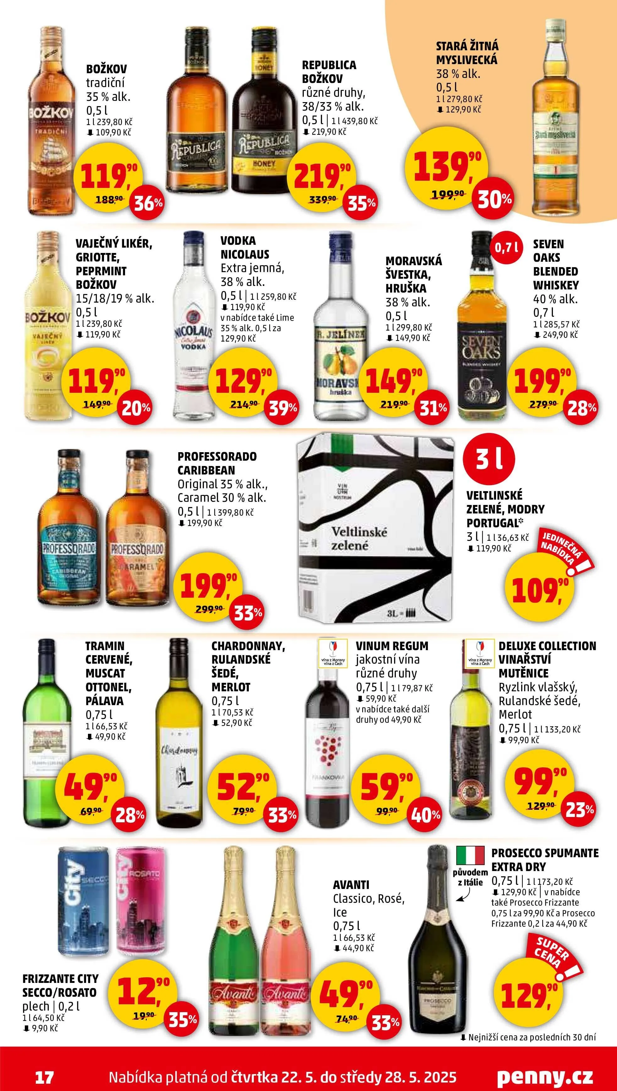 V letáku obchodu Penny Market najdete širokou nabídku alkoholických nápojů a vín. Mezi oblíbené produkty patří Božkov s různými příchutěmi, jako je vaječný likér, griotte a peprmint, za cenu 109,90 Kč. Dále nabízíme vína jako Tramin, Muscat Ottonel a Pálava za 49,90 Kč.