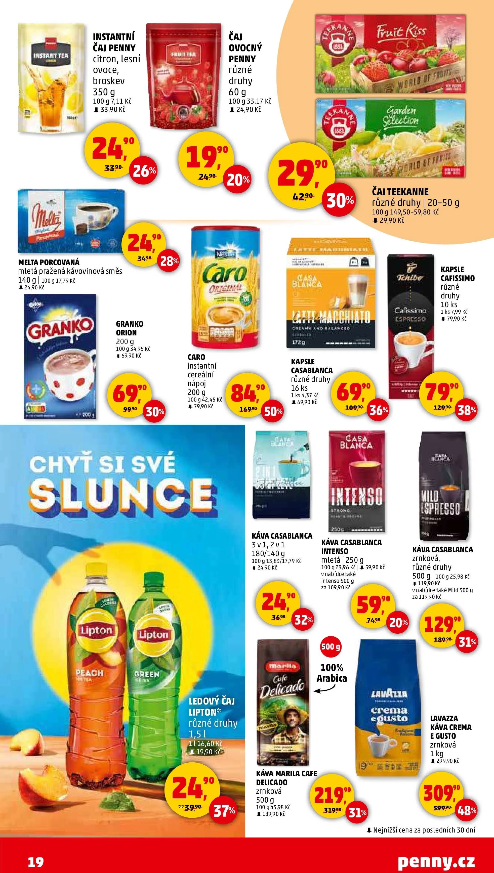 V letáku obchodu Penny Market najdete širokou nabídku instantních čajů a káv. Mezi oblíbené produkty patří instantní čaj Penny v příchutích citron, lesní ovoce a broskev, který je k dostání za 33,90 Kč za 350 g. Dále si můžete vybrat mletou praženou kávovinovou směs Melta, která stojí 24,90 Kč za 60 g.