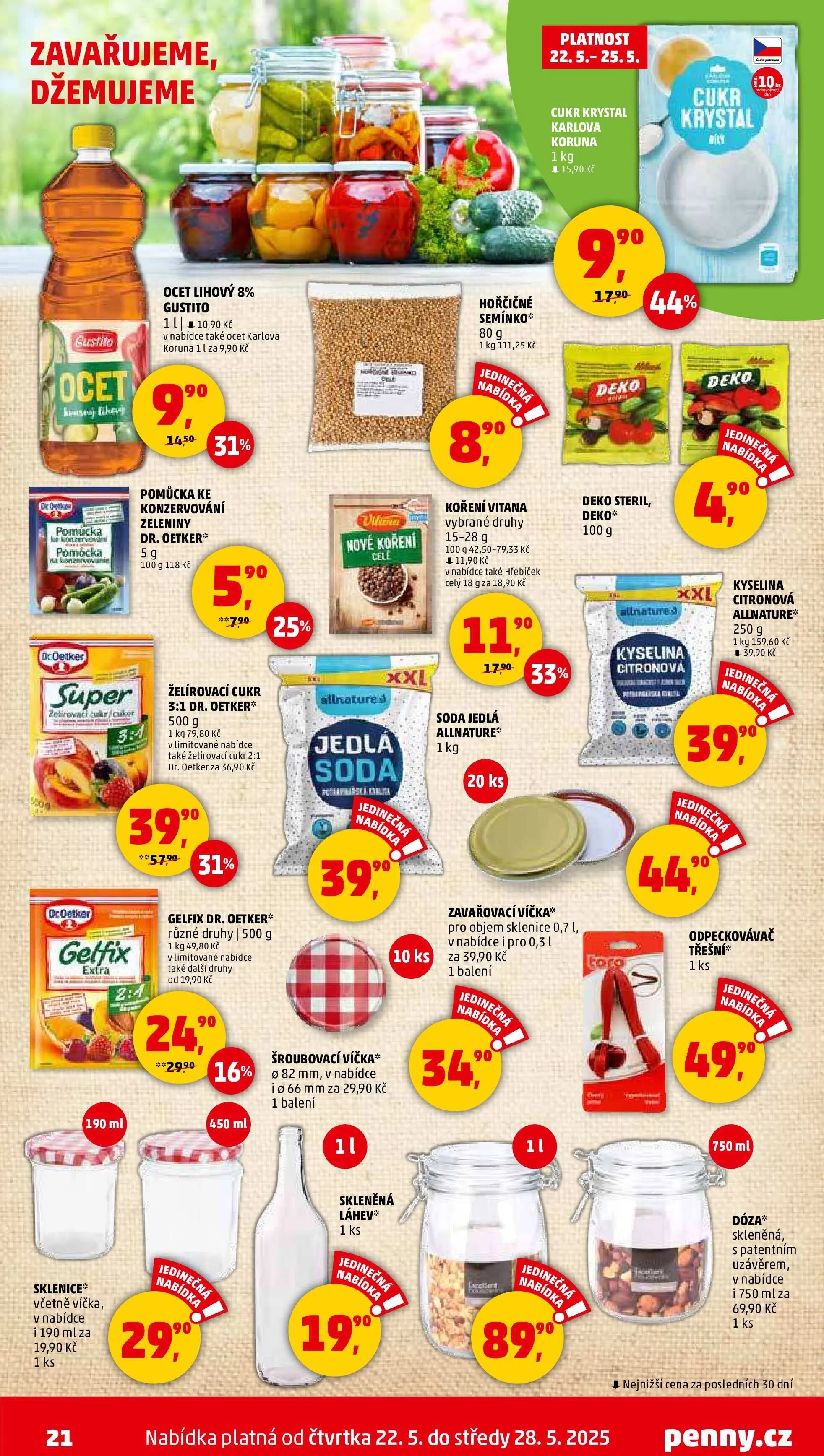 Pro sladění vašich zavařenin je k dispozici želírovací cukr Dr. Oetker 500 g za 79,80 Kč a kyselina citronová Allnature 250 g za 39,90 Kč. Nezapomeňte také na zavařovací víčka a šroubovací víčka, které jsou v nabídce od 29,90 Kč.