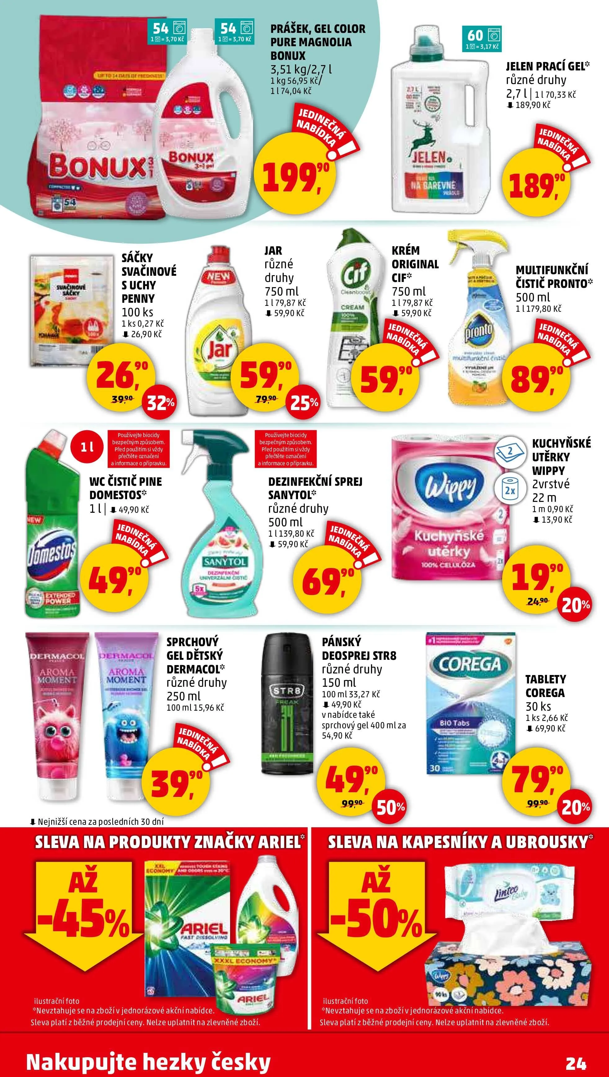 Pro úklid domácnosti doporučujeme WC čistič Pine Jelen, 750 ml za 59,90 Kč, a multifunkční čistič Pronto, 500 ml za 79,90 Kč. Nezapomeňte také na dezinfekční sprej Sanytol, 500 ml za 59,90 Kč, a pánský deosprej Str8, 150 ml za 49,90 Kč.