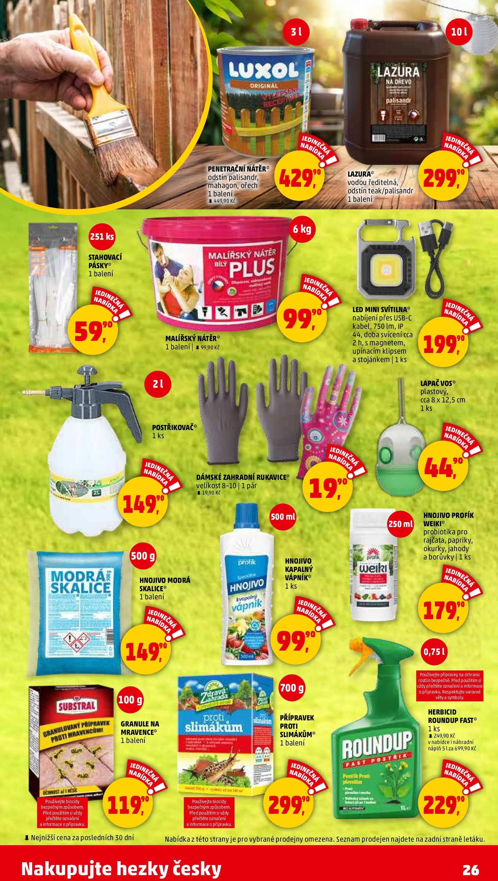 V letáku obchodu Penny Market najdete širokou nabídku produktů pro domácnost a zahradu. Mezi nimi je penetrační nátěr v odstínech palisandr a ořech, malířský nátěr za 99,90 Kč, a praktické stahovací pásky. Pro zahradníky jsou k dispozici dámské zahradní rukavice a postřikovač.