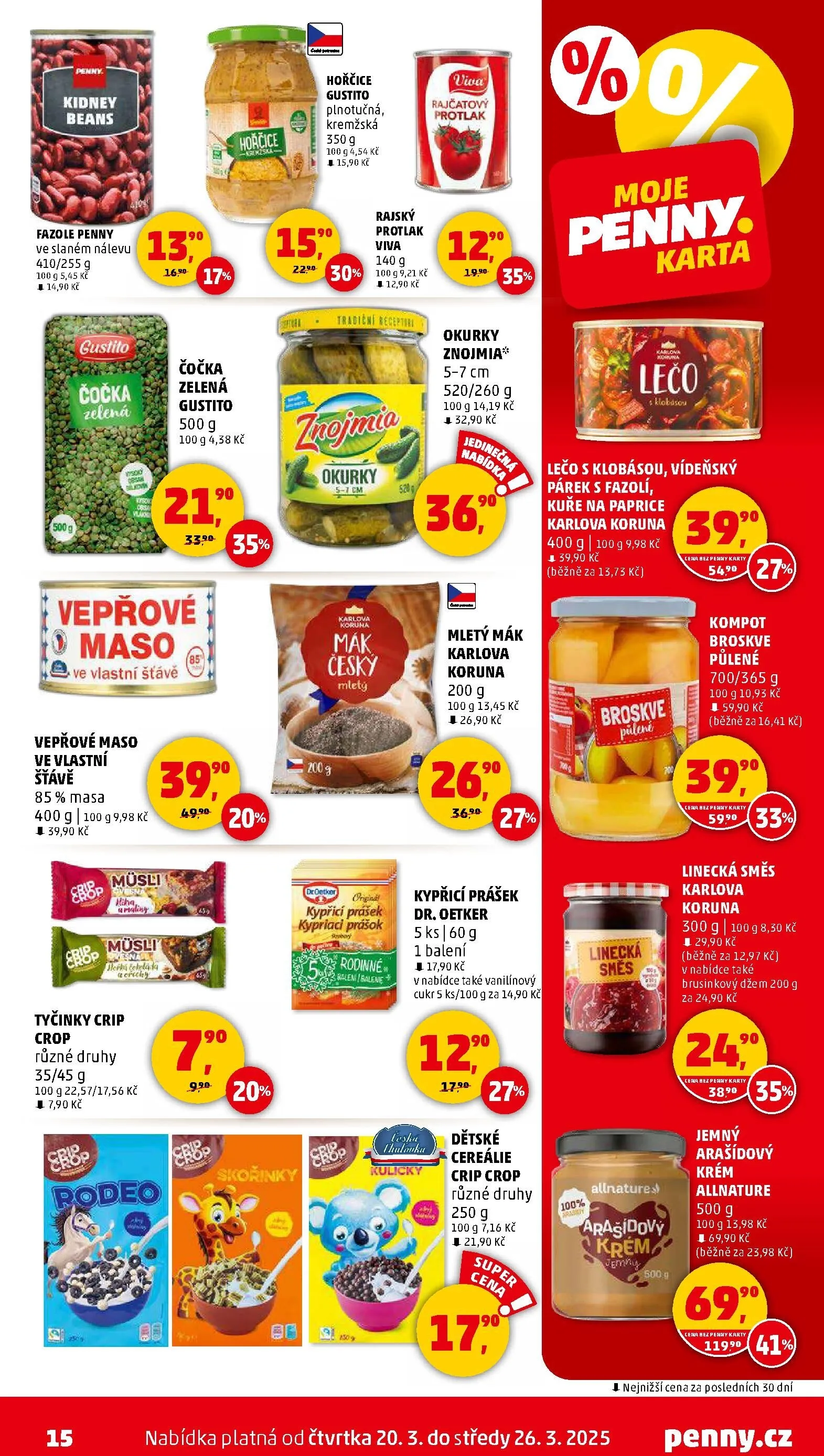 Mezi nimi jsou například fazole v slaném nálevu Penny (410/255 g) za 14,90 Kč, hořčice Gustito plnotučná (350 g) za 15,90 Kč a rajský protlak Viva (140 g) za 12,90 Kč.