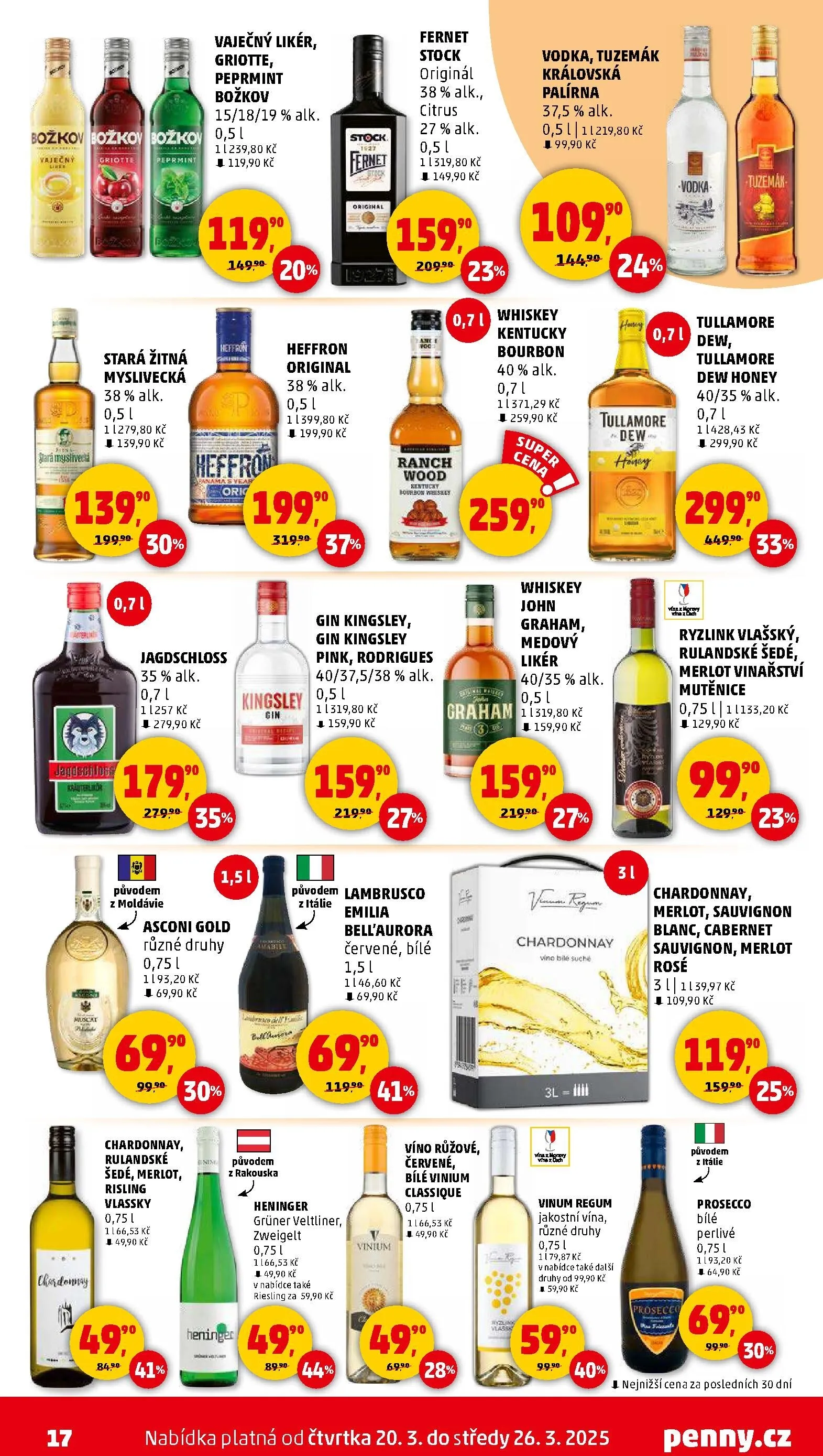 V letáku obchodu Penny Market najdete širokou nabídku alkoholických nápojů a vín. Mezi oblíbené produkty patří Božkov vaječný likér, Griotte a Peppermint, které jsou k dostání za 119,90 Kč. Dále můžete vyzkoušet Heffron Original za 199,90 Kč nebo Fernet Stock Originál za 149,90 Kč.