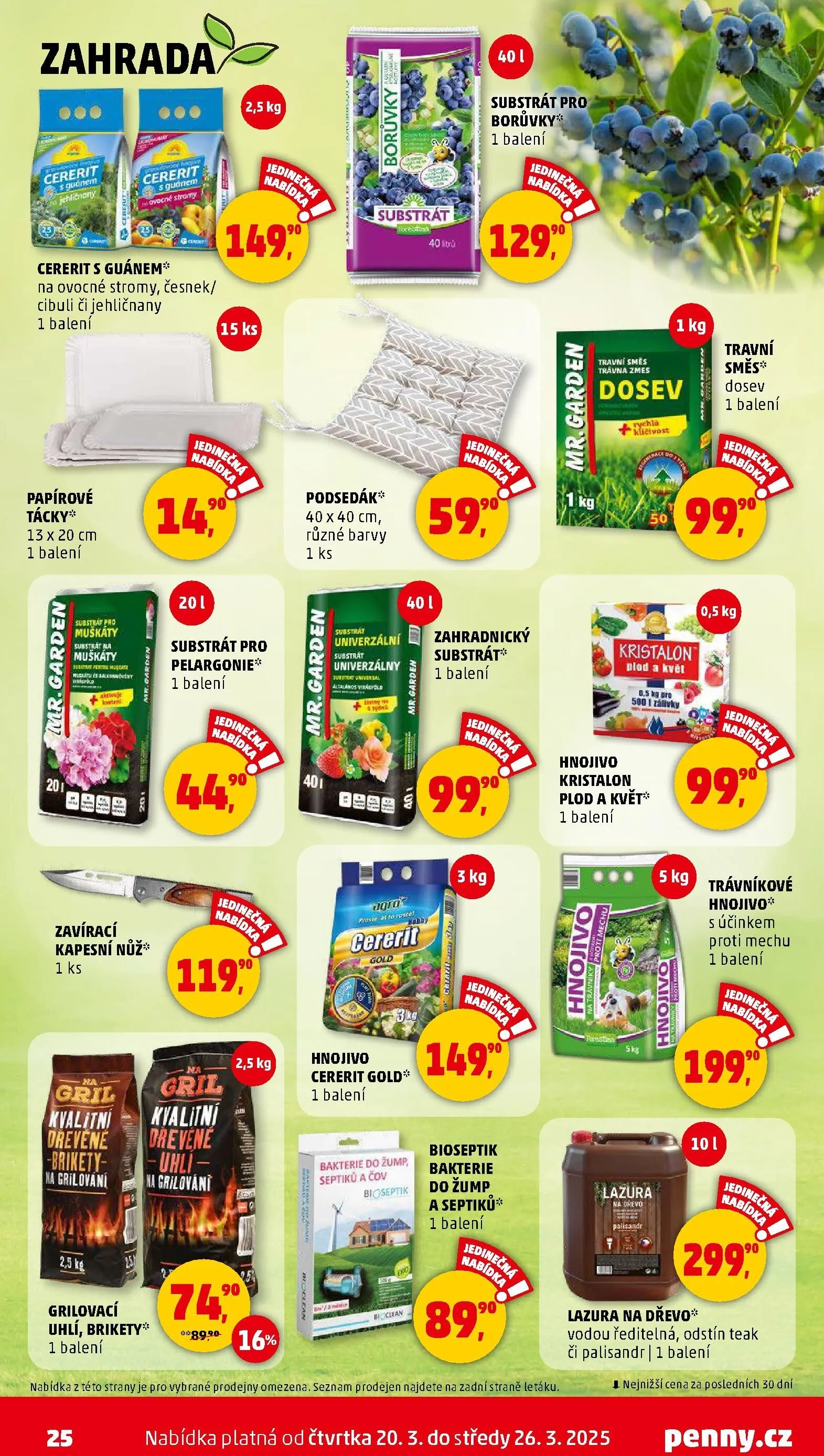 Všechny produkty jsou k dispozici v omezeném množství a platnost nabídky je od 20. do 26. března 2025. Pro více informací navštivte penny.cz.