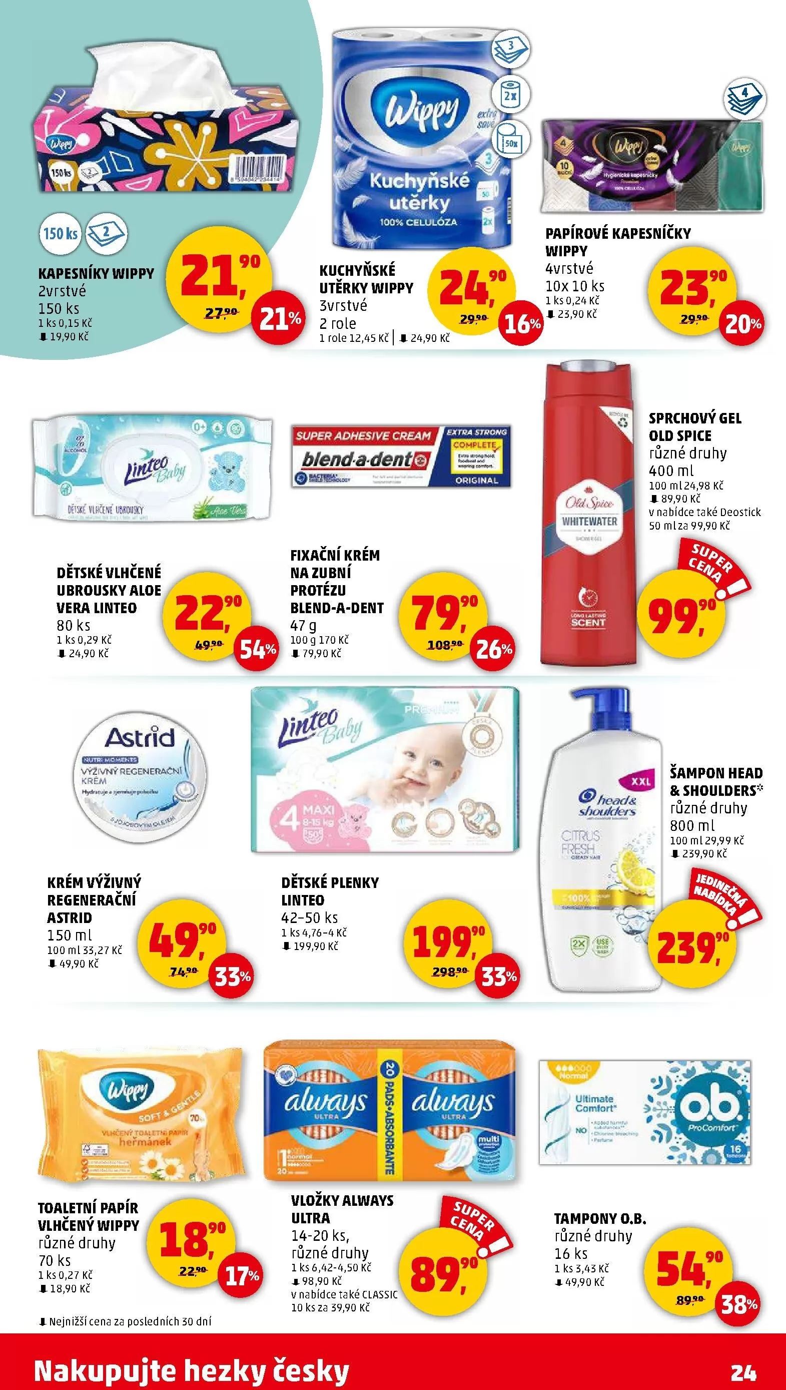 V letáku obchodu Penny Market najdete širokou nabídku produktů pro každodenní potřeby. Mezi nimi jsou kuchyňské papírové kapesníčky Wippy, 2vrstvé, balení 150 ks za 19,90 Kč. Dále nabízíme dětské vlhčené ubrousky s aloe vera Linteo, 80 ks za 24,90 Kč.