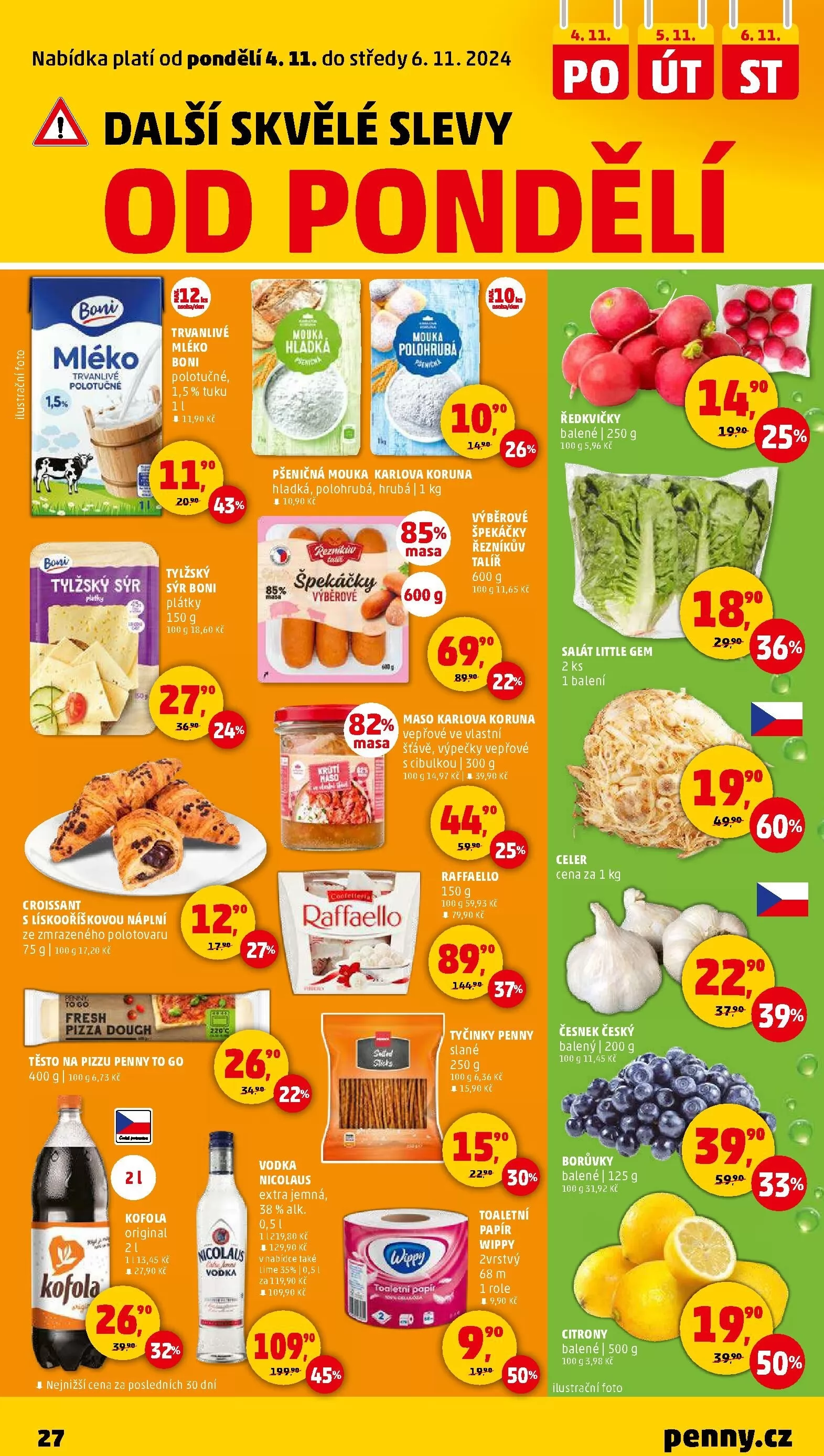 V letáku obchodu Penny Market najdete skvělé slevy, které platí od pondělí 4.11. do středy 6.11.2024. Nabídka zahrnuje trvanlivé polotučné mléko Tylžský za 11,90 Kč, sýry Boni v plátcích za 18,60 Kč/100 g a různé druhy mouky Karlova koruna.