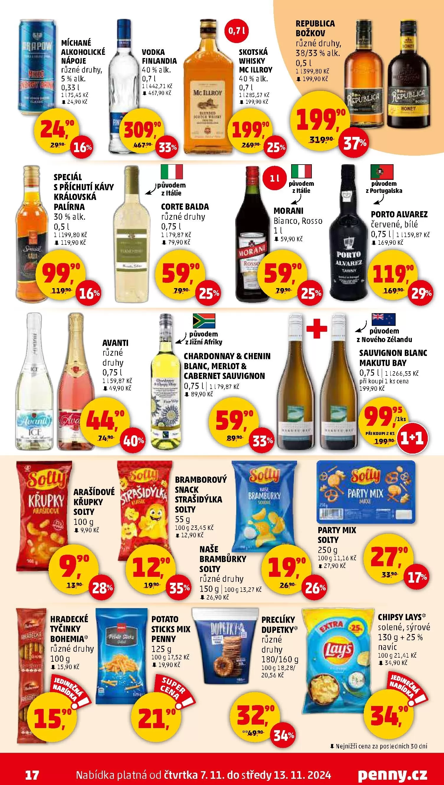 V letáku obchodu Penny Market najdete širokou nabídku alkoholických nápojů a snacků. Mezi míchanými alkoholickými nápoji se můžete těšit na speciál s příchutí kávy od Královské palírny za 119,90 Kč. Vodka Finlandia je k dostání za 467,90 Kč a skotská whisky Mc Illroy za 199,90 Kč.