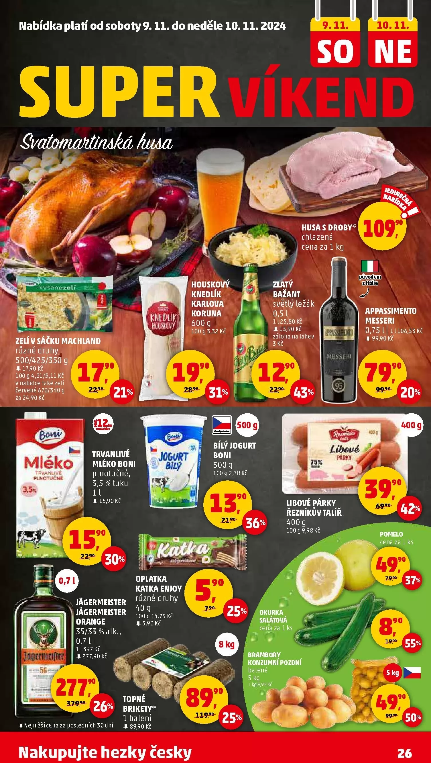 V nabídce jsou také oplatky Katka Enjoy za 5,90 Kč (různé druhy, 100 g) a chlazená husa s droby za 13,90 Kč za 1 kg.