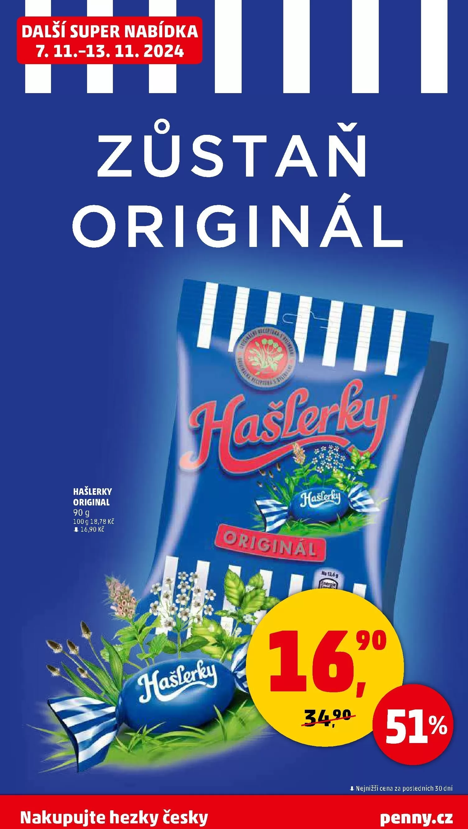 V letáku obchodu Penny Market na období od 7. do 13. listopadu 2024 najdete skvělou nabídku na originální hašlerky. Balení 100 g je nyní za cenu 16,90 Kč, což představuje nejnižší cenu za posledních 30 dní. Nezapomeňte nakupovat hezky česky! Navštivte penny.cz pro více informací.