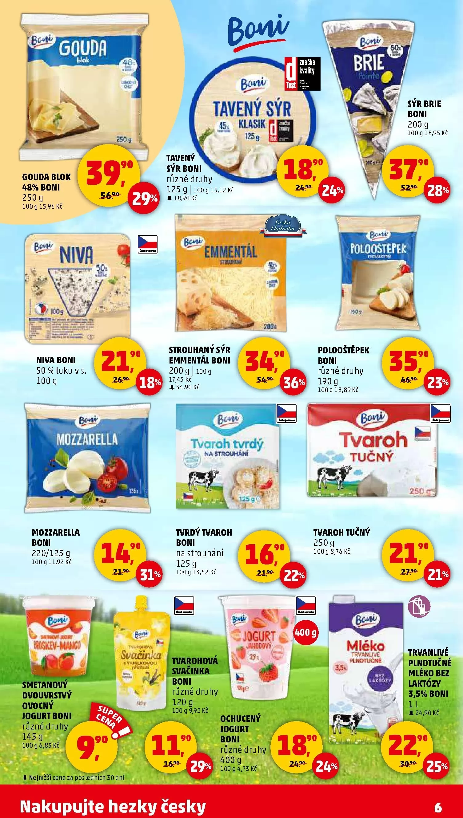 V letáku obchodu Penny Market najdete širokou nabídku mléčných výrobků značky Boni. Mezi nimi se objevují různé druhy sýrů, jako je Gouda blok za 15,96 Kč, tavený sýr Boni v různých variantách za 15,12 Kč a sýr Brie za 18,95 Kč. Dále si můžete vybrat z tvarohů, například tučný tvaroh za 8,76 Kč nebo tvrdý tvaroh.