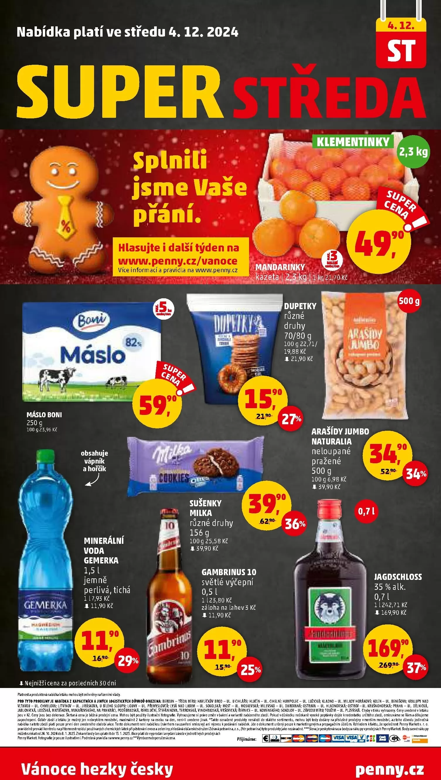 V letáku obchodu Penny Market na středu 4.12.2024 najdete širokou nabídku produktů. Mezi nimi jsou klementinky a mandarinky, které splní vaše očekávání. Dále nabízíme máslo Boni v balení 250 g, které obsahuje vápník a hořčík.