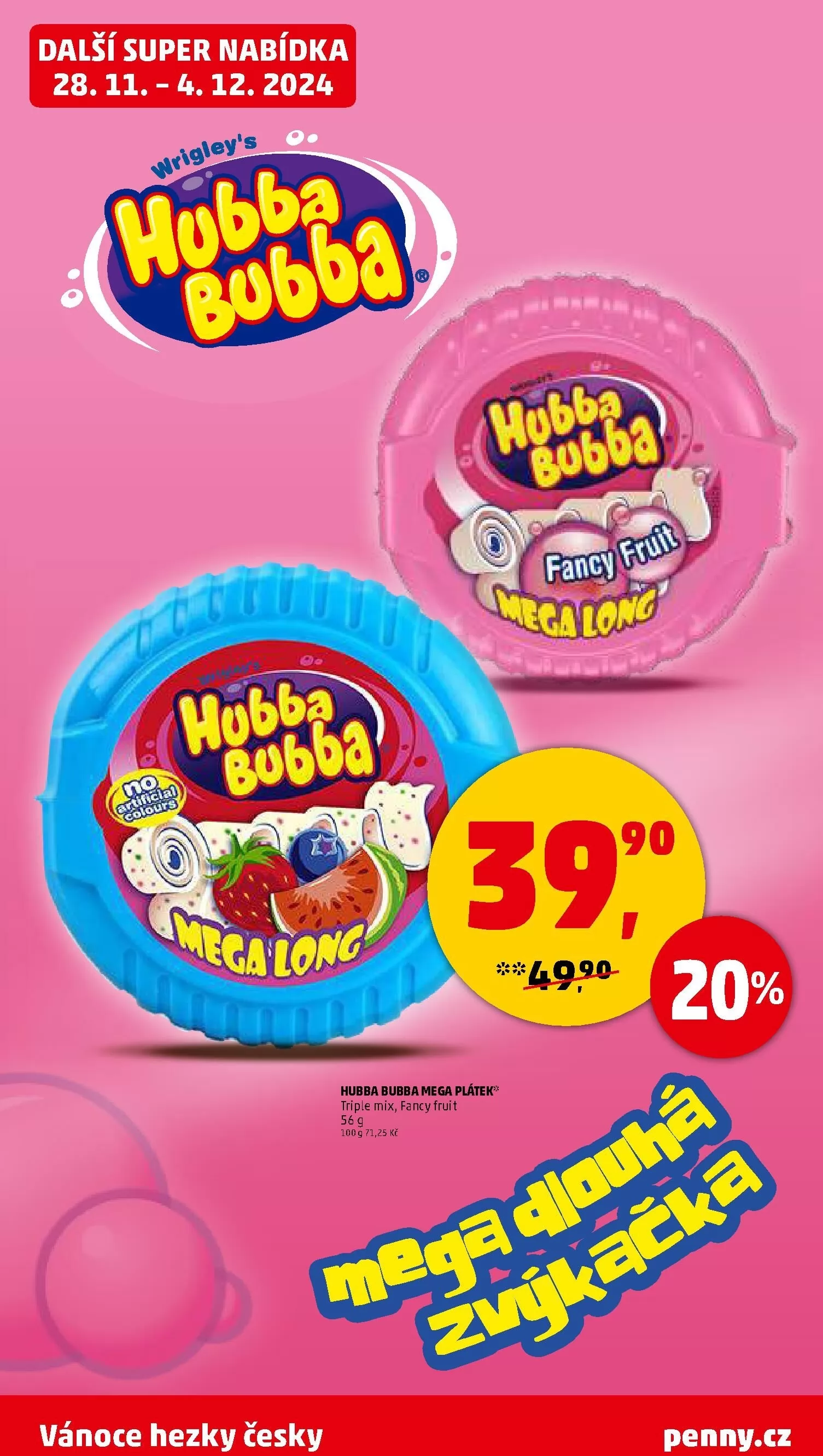 V letáku obchodu Penny Market na období od 28. 11. do 4. 12. 2024 najdete další super nabídku! Mezi produkty se objevuje Hubba Bubba mega plátek ve variantách triple mix a fancy fruit za skvělou cenu 71,25 Kč. Nezapomeňte, že Vánoce hezky česky jsou na dosah! Pro více informací navštivte penny.cz.