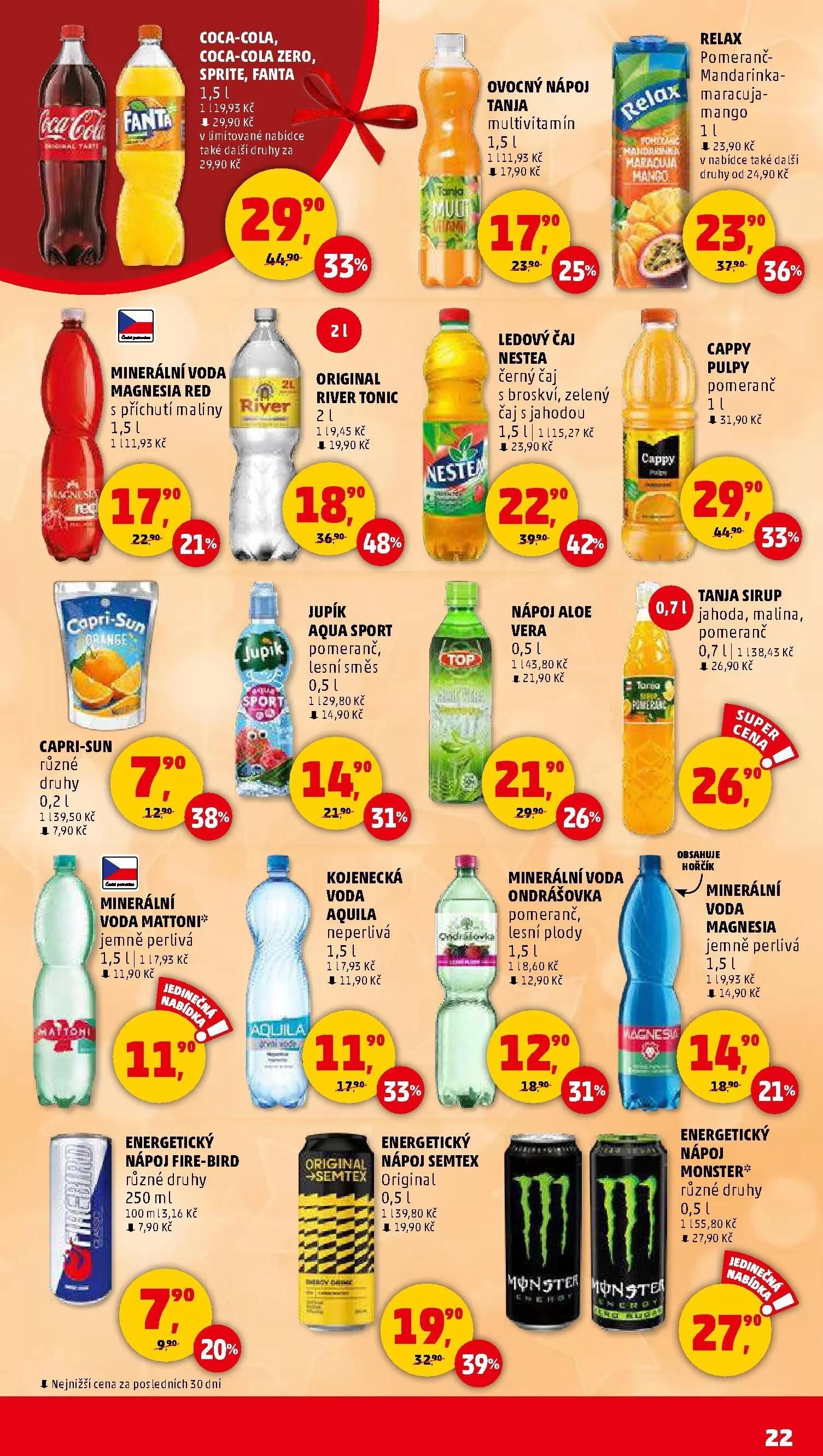 Pro milovníky ovocných nápojů je k dispozici Tanja s příchutí multivitaminu za 17,90 Kč a ledový Nestea s broskví nebo jahodou za 23,90 Kč. Nezapomeňte také na minerální vodu Ondrášovka s příchutí pomeranče a lesních plodů za 12,90 Kč.