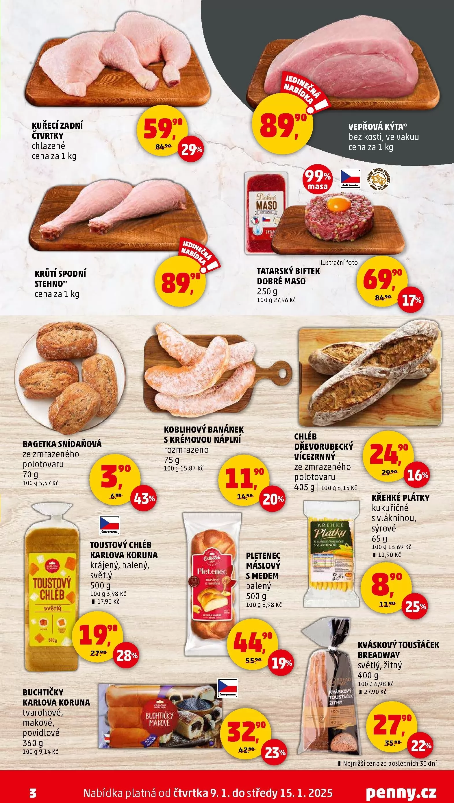 V letáku obchodu Penny Market najdete širokou nabídku kvalitních produktů za skvělé ceny. Mezi nimi se objevují chlazené krůtí spodní stehno a vepřová kýta bez kosti, které jsou ideální pro přípravu chutných pokrmů. Pro milovníky snídaní je zde bagetka snídaňová a toustový chléb Karlova koruna, který je krájený a balený.