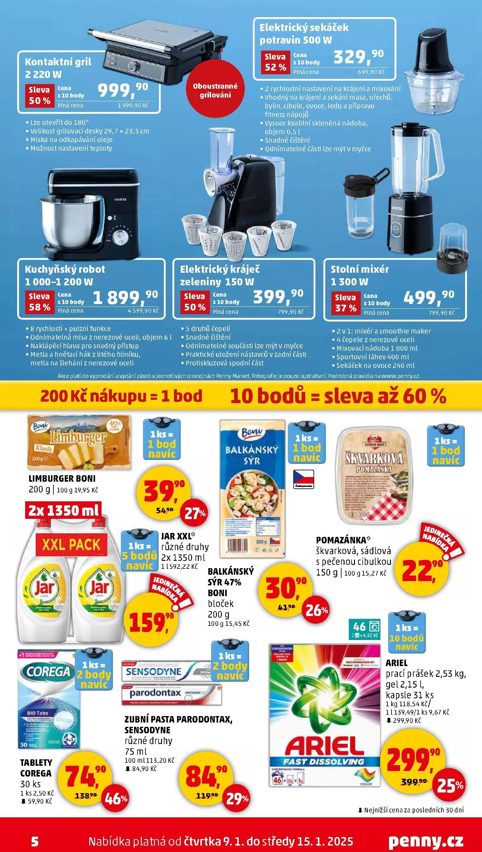 Stolní mixér s 8 rychlostmi a pulzní funkcí můžete pořídit za 499,90 Kč. V letáku také najdete akční nabídky potravin, jako jsou balkánský sýr a škvarková pomazánka, které přinášejí další body k nákupu. Akce platí do vyprodání zásob. Nezapomeňte, že za každých 200 Kč nákupu získáte 1 bod, a s 10 body můžete ušetřit až 60 %.