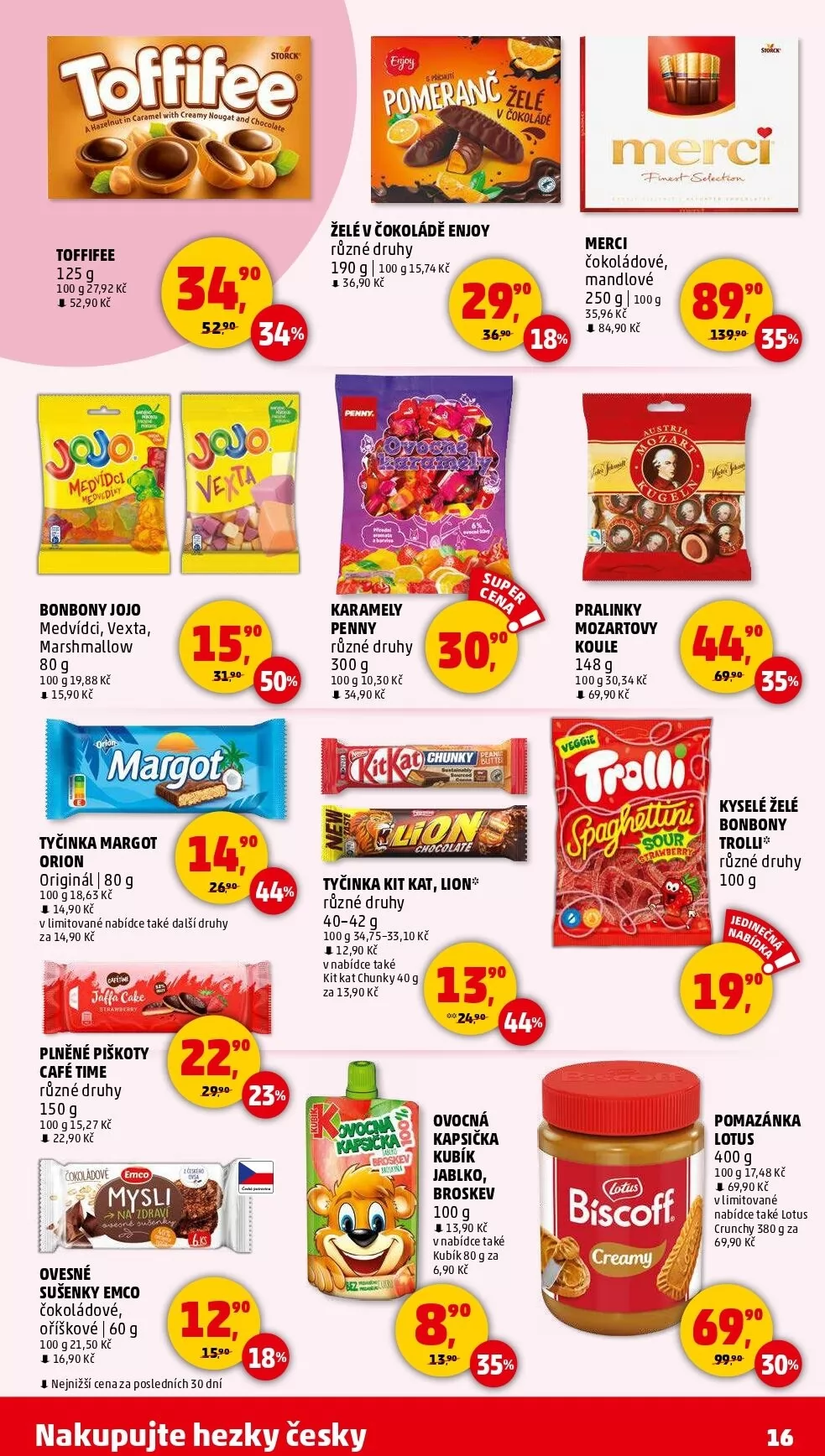 V letáku obchodu Penny Market najdete širokou nabídku sladkostí a pochutin. Mezi nimi jsou oblíbené Toffifee (125 g) za 52,90 Kč, bonbony Jojo medvídci (80 g) za 15,90 Kč a tyčinka Margot (80 g) za 14,90 Kč. Nezapomeňte také na želé v čokoládě Enjoy (190 g) za 56,90 Kč a různé druhy karamelů Penny (300 g) za 54,90 Kč.