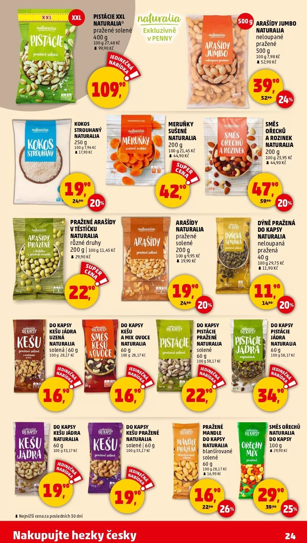 V letáku obchodu Penny Market najdete širokou nabídku produktů značky Naturalia. Mezi nimi se objevují pražené a solené pistácie, arašídy a kešu ořechy. Například 400 g pražených solených pistácií je k dostání za 99,90 Kč, zatímco 200 g sušených meruněk pořídíte za 44,90 Kč.