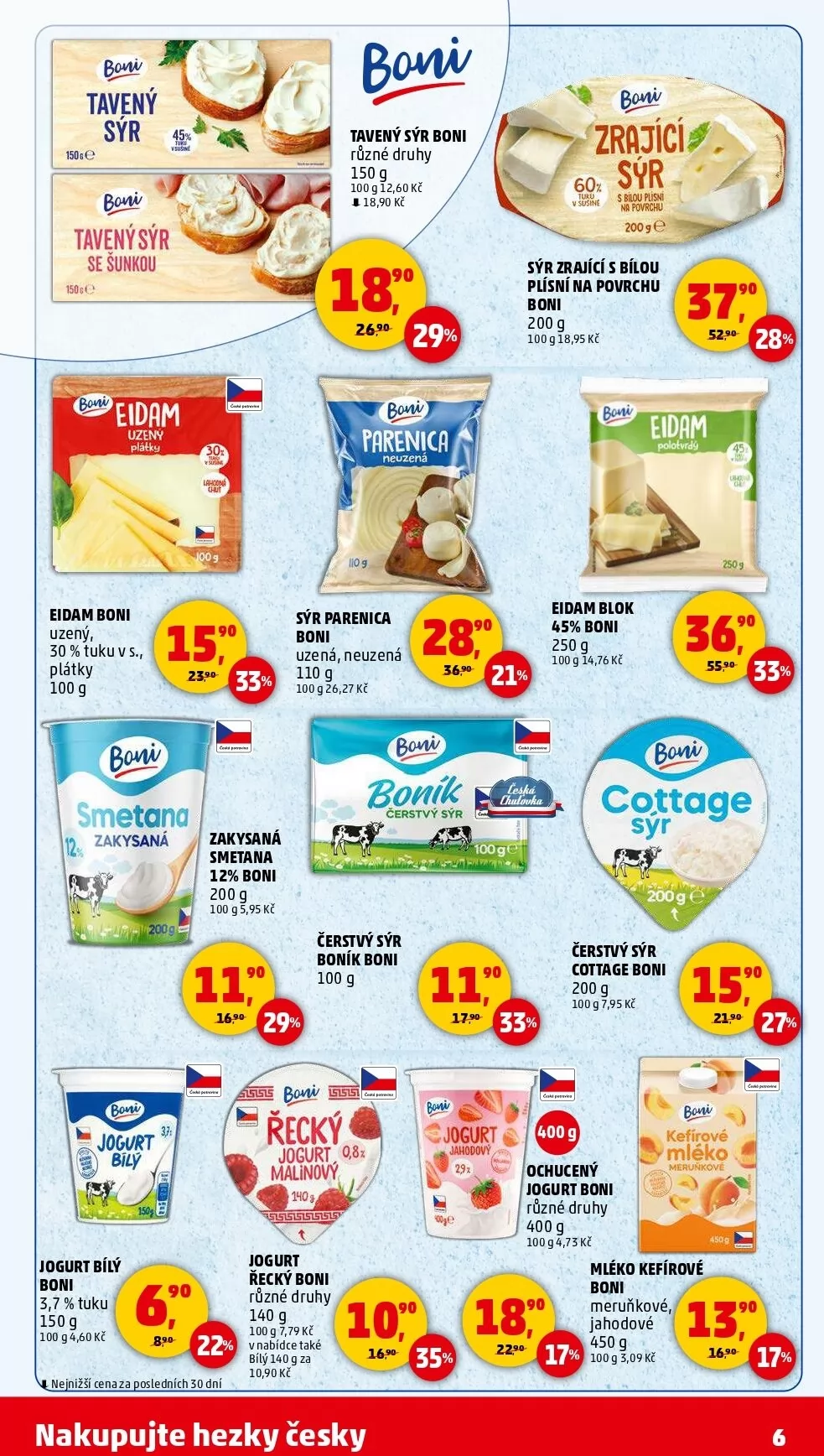 V letáku obchodu Penny Market najdete širokou nabídku kvalitních mléčných výrobků značky Boni. Mezi nimi se objevují tavené sýry, jako je tavený sýr se šunkou a různé druhy eidamu, včetně uzeného eidamu v plátcích. Dále si můžete vybrat zakysanou smetanu, čerstvý sýr Boník, nebo zrající sýr s bílou plísní.