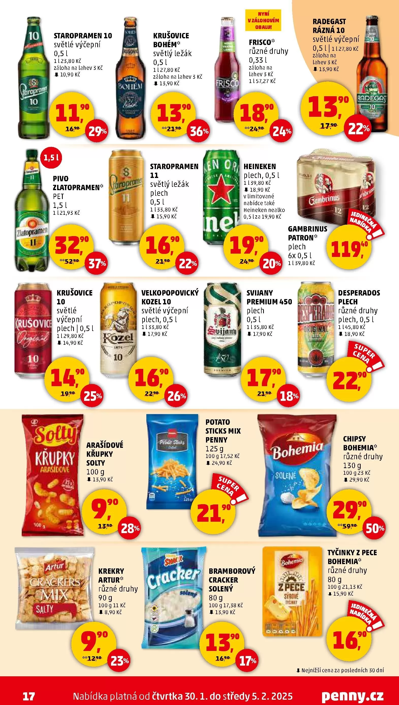 V letáku obchodu Penny Market najdete širokou nabídku nápojů a snacků. Mezi oblíbenými pivy se objevují Staropramen, Zlatopramen, Krušovice a Velkopopovický Kozel, které jsou k dispozici za ceny od 10,90 Kč do 18,90 Kč. Nechybí ani nealkoholické varianty, jako je Heineken nealko.