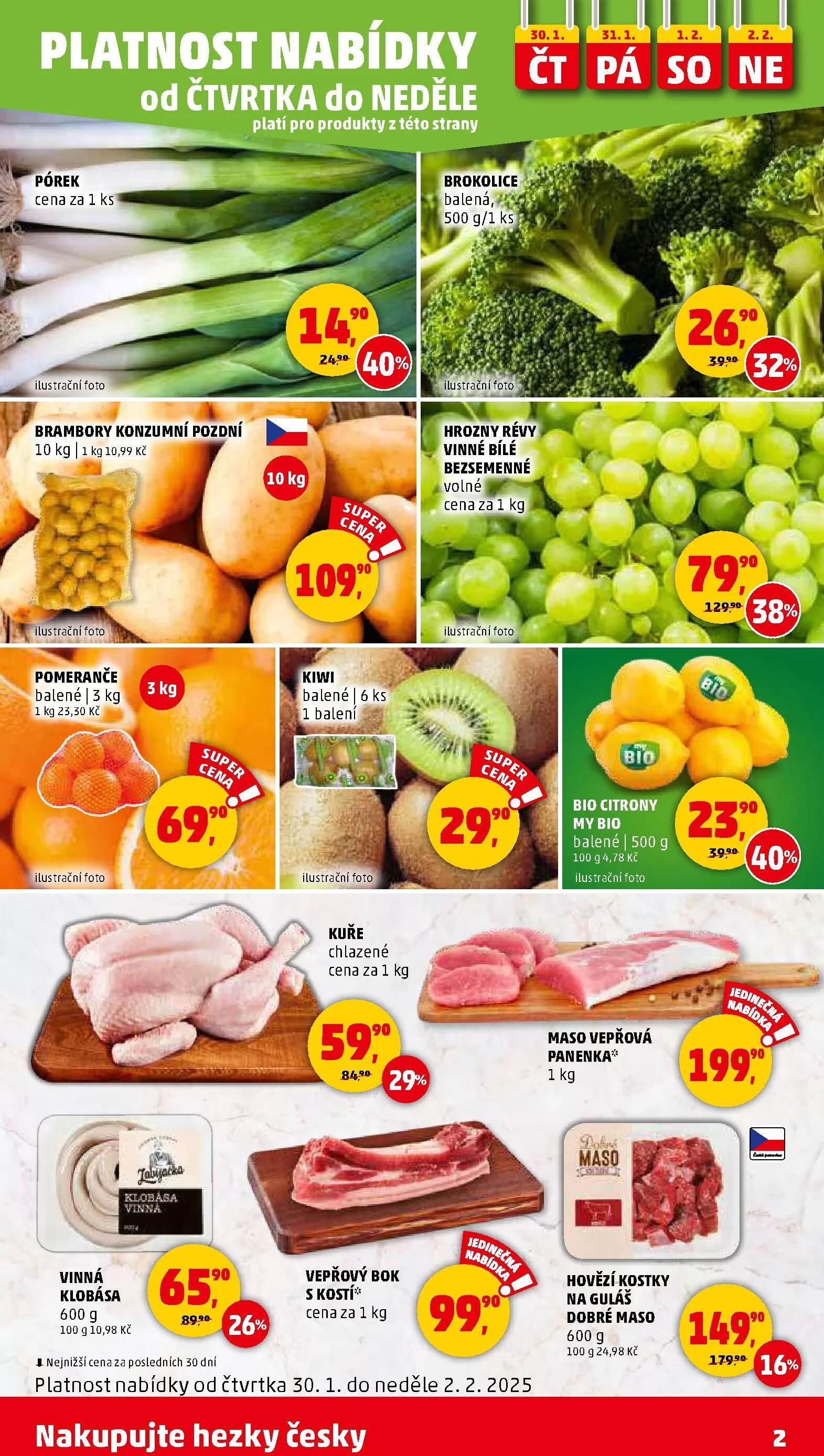 V nabídce jsou také bio citrony balené po 500 g za 4,78 Kč/100 g, vepřová panenka a hovězí kostky na guláš za 24,98 Kč/100 g. Nezapomeňte na chlazené kuře a vepřový bok s kostí, které jsou k dispozici za nejnižší ceny za posledních 50 dní. Nakupujte hezky česky a využijte této skvělé nabídky!