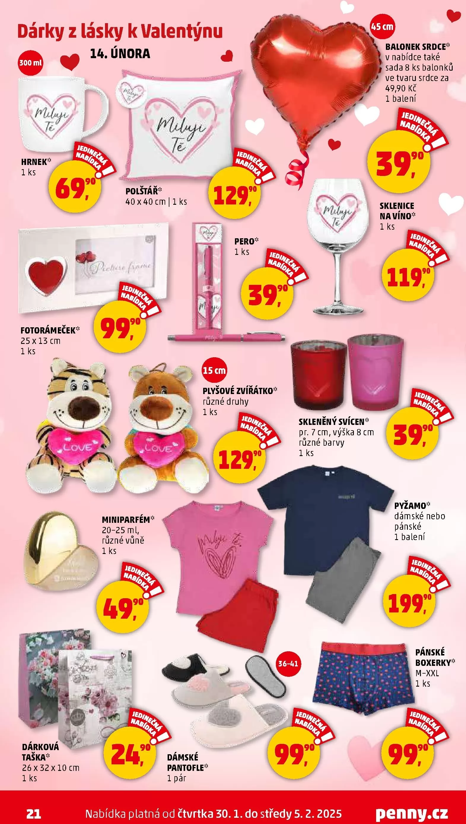V obchodě Penny Market najdete skvélé dárky k Valentýnu, které potěší vaše blízké. Nabízíme hrnek za 90 Kč, polštář o rozměrech 40x40 cm za 90 Kč, a fotorámeček 25x13 cm. Pro milovníky vůní máme miniparfém (20-25 ml, různé vůně) za 90 Kč. Potěšte své děti plyšovým zvířátkem (různé druhy) za 36-41 Kč nebo balonkem ve tvaru srdce, který je k dispozici také v sadě 8 ks za 49,90 Kč.
