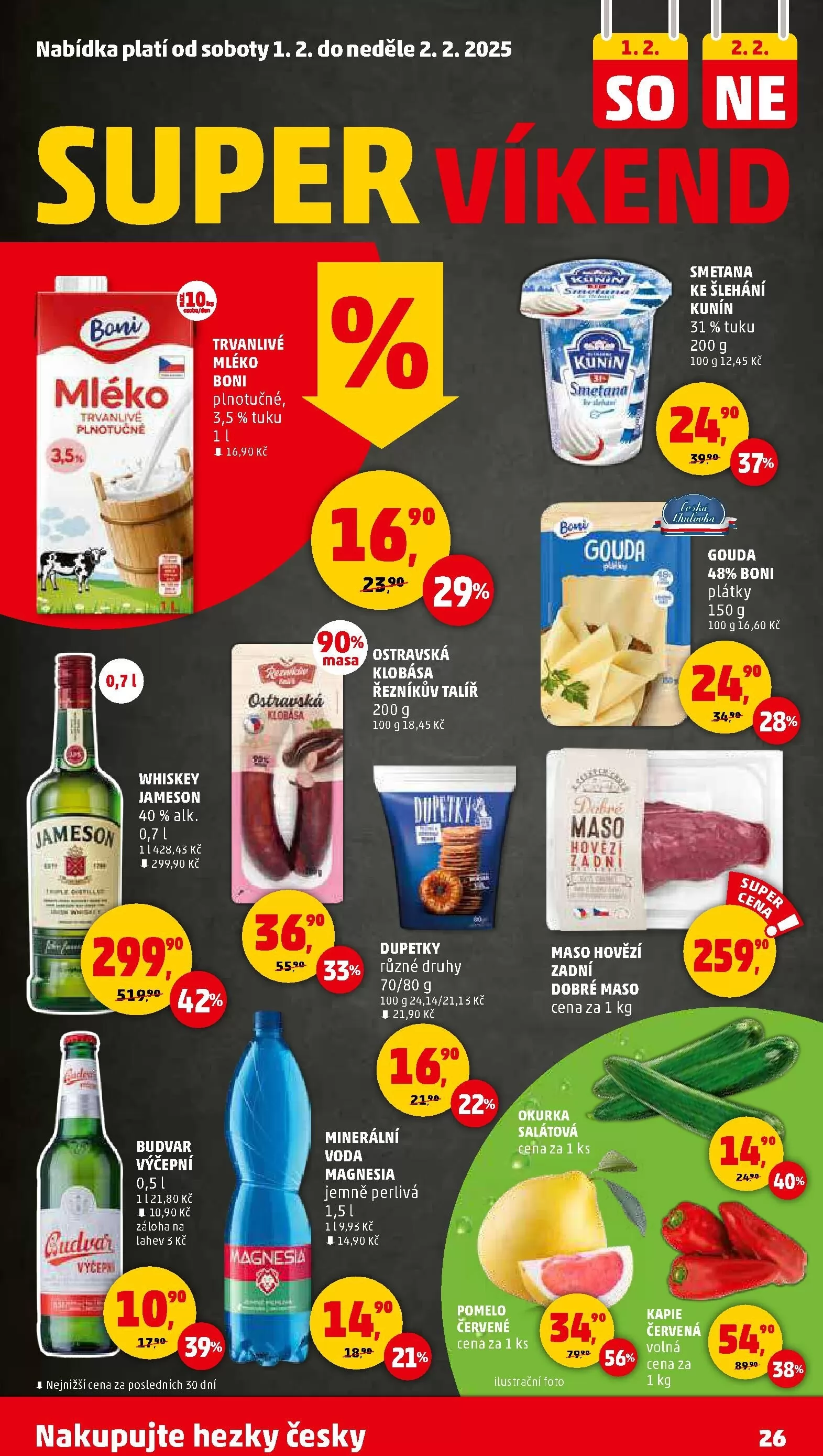 Dále si můžete vychutnat goudu Kunín s 28 % tuku za 16,60 Kč za 100 g a smetanu ke šlehání Kunín s 31 % tuku za 12,45 Kč za 100 g. Pro milovníky alkoholu je v nabídce whiskey Jameson za 299,90 Kč a výčepní pivo Budvar za 10,90 Kč.