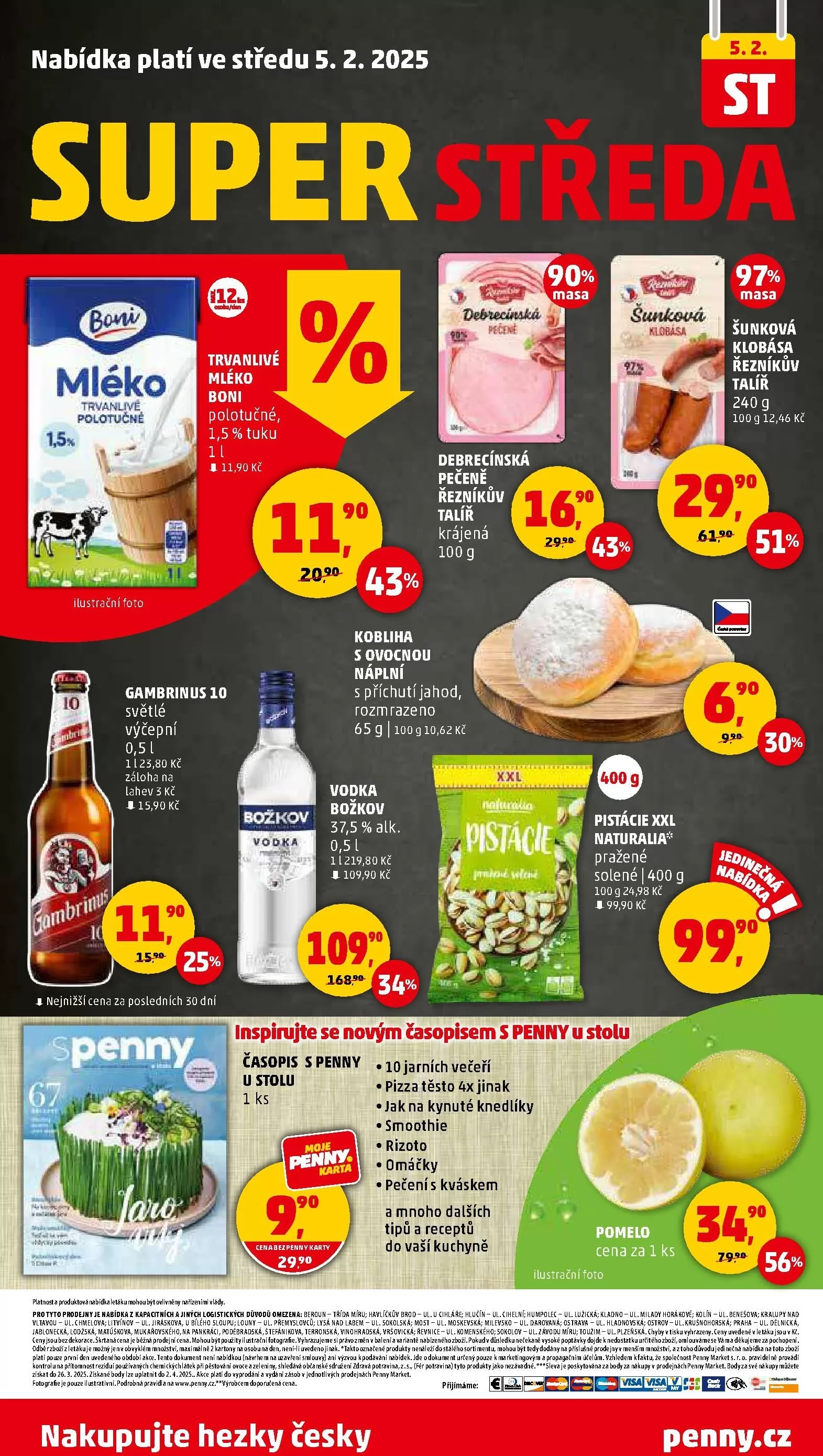 V letáku obchodu Penny Market na středu 5. února 2025 najdete širokou nabídku produktů za výhodné ceny. Mezi nimi je trvanlivé polotučné mléko za 11,90 Kč, debrecínská pečeně krájená za 90 Kč/100 g a šunková klobása za 12,46 Kč/100 g. Pro milovníky sladkostí je k dispozici kobliha s ovocnou náplní za 65 Kč a pistácie Naturalia za 99,90 Kč/400 g. Nezapomeňte také na Gambrinus 10 světlé pivo za 15,90 Kč.