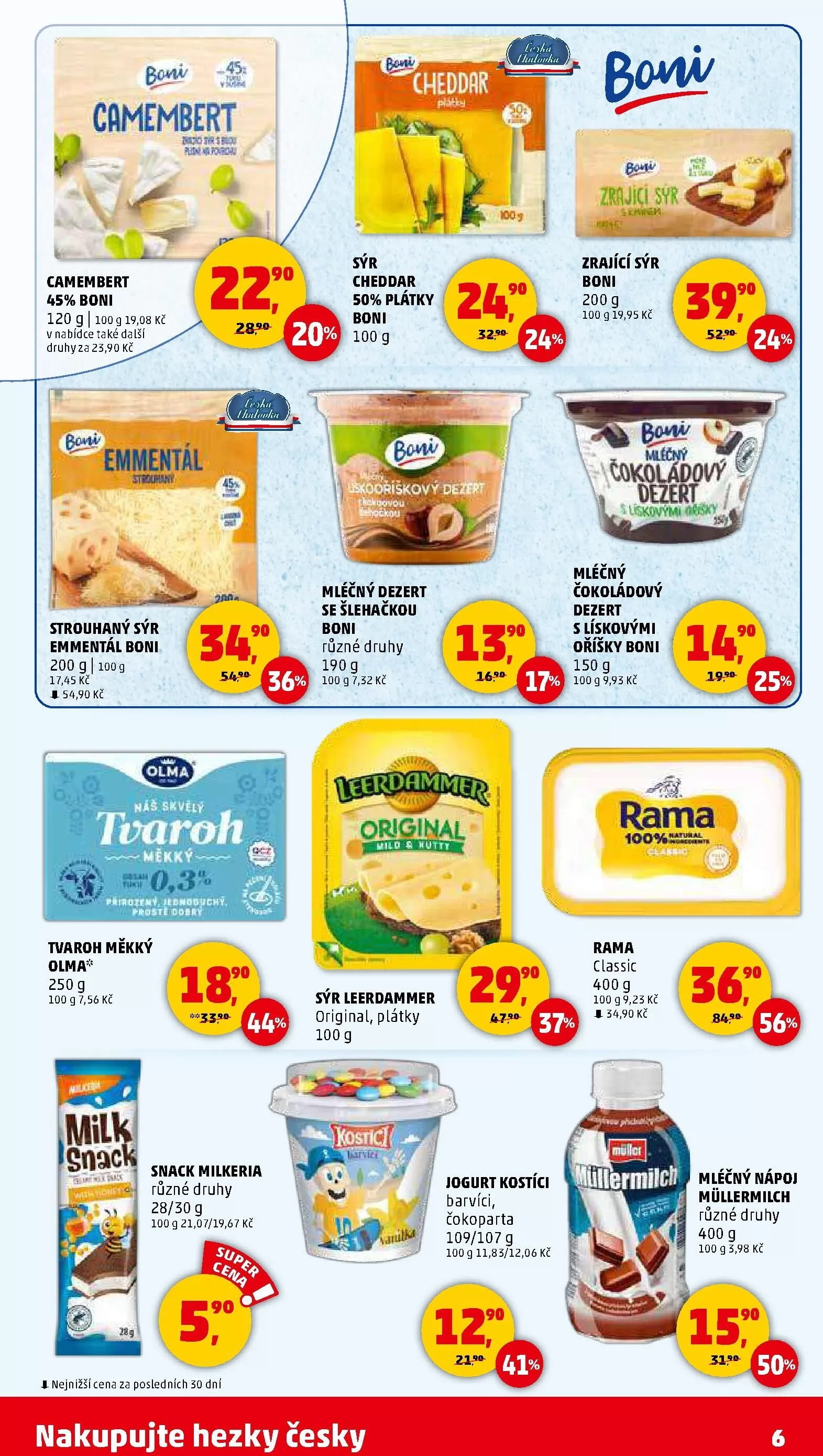 Mezi dalšími produkty najdete zrající sýr Boni za 19,95 Kč za 100 g a čokoládový dezert s lískovými oříšky Boni za 9,95 Kč za 100 g. Tvaroh Olma je k dispozici za 7,56 Kč za 100 g.