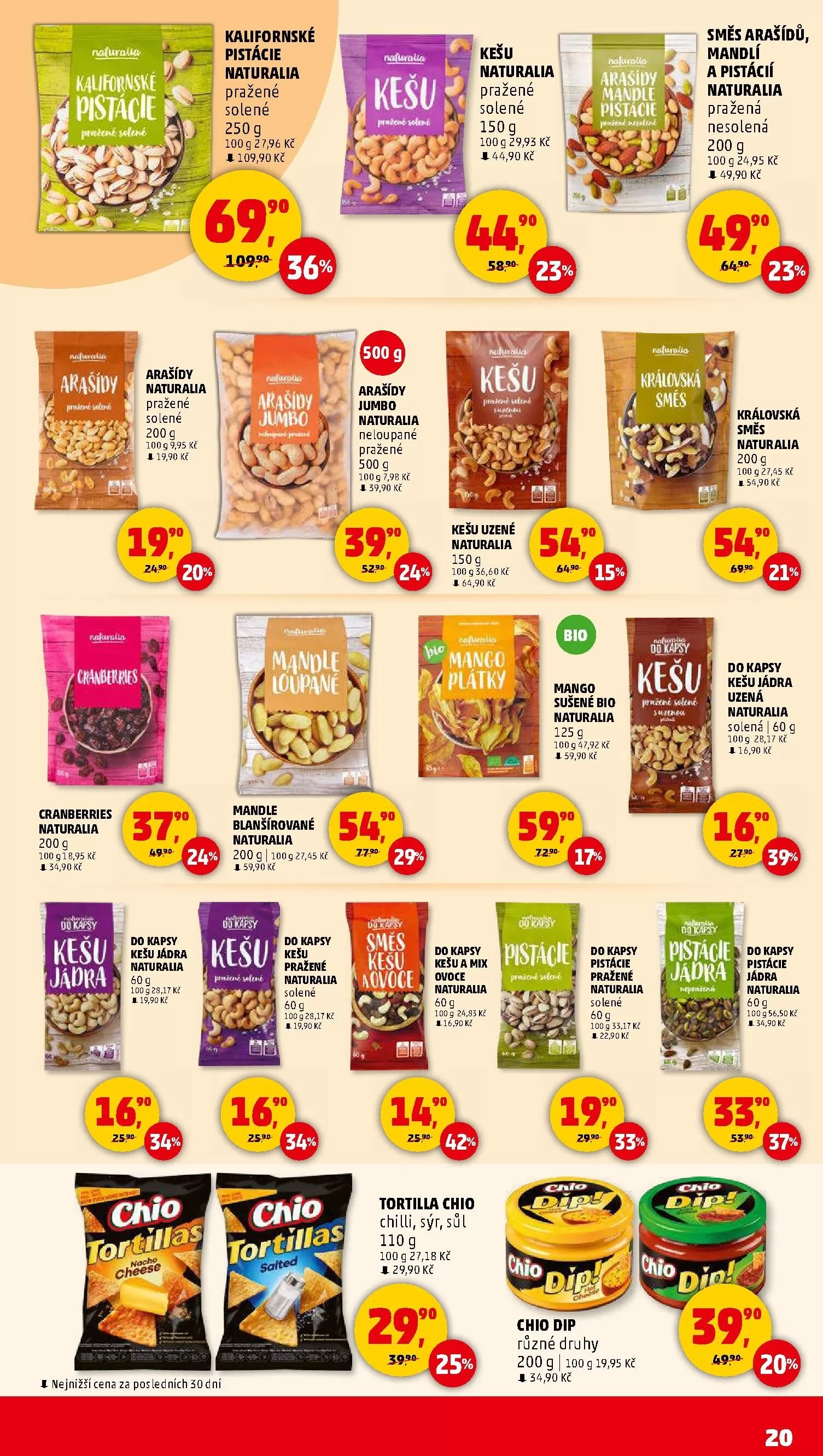 Pro milovníky sušeného ovoce máme bio mango naturalia za 47,92 Kč za 100 g a cranberries za 54,90 Kč za 200 g. Nezapomněli jsme ani na chutné dipy chio, které jsou k dostání v různých druzích za 19,95 Kč za 200 g.