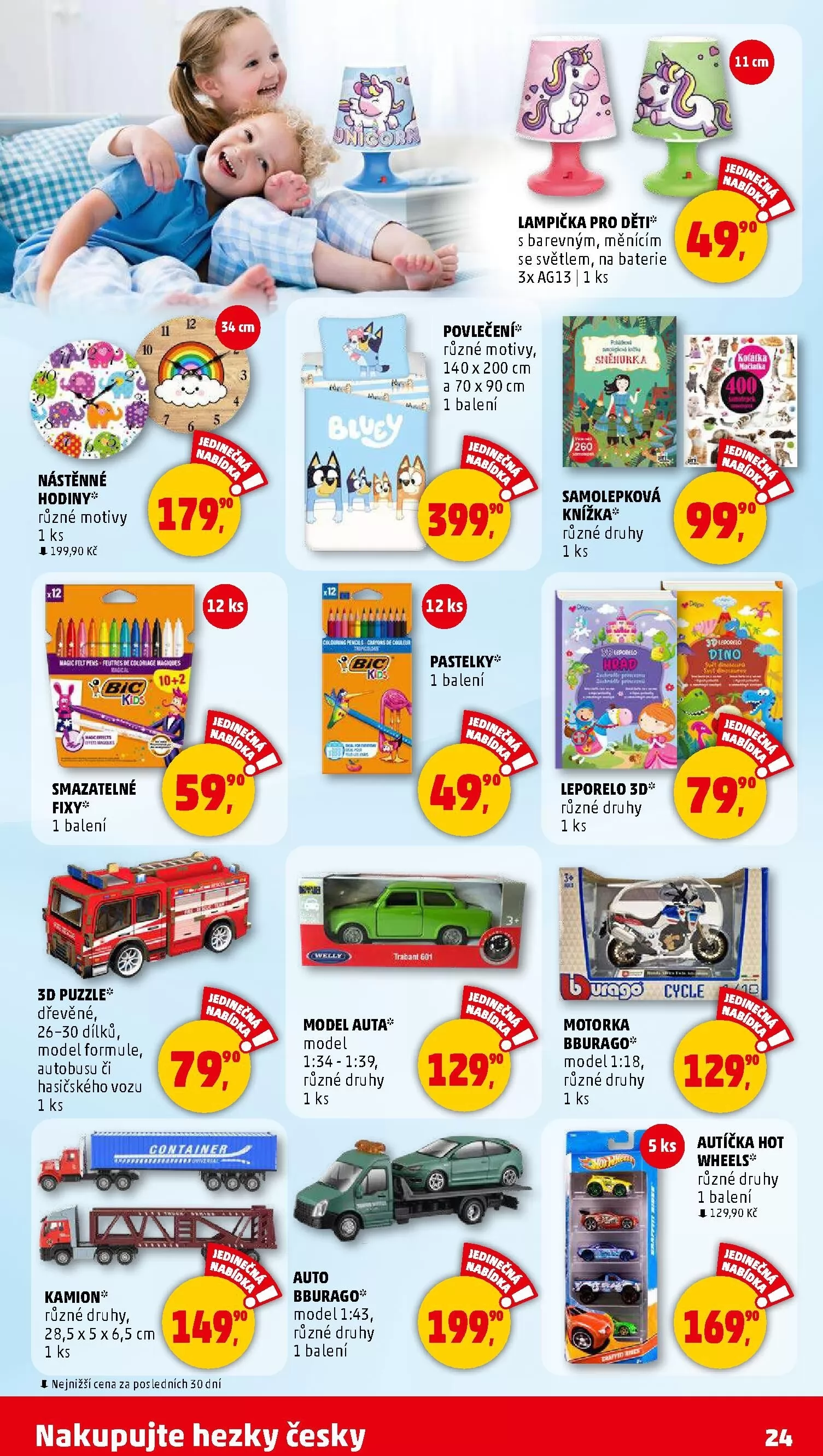 V letáku obchodu Penny Market najdete širokou nabídku produktů pro děti. Mezi nimi je lampička s barevným, měnícím se světlem na baterie, která měří 11 cm. Dále nabízíme nástěnné hodiny s různými motivy za cenu 199,90 Kč. Pro kreativní zábavu jsou k dispozici smazatelné fixy a pastelky v balení.